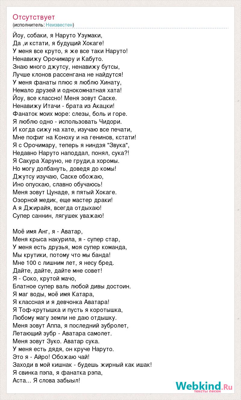 Йоу, собаки, я Наруто Узумаки, Да ,и кстати, я будущий Хокаге! У меня все круто, я же все таки Наруто! Ненавижу Орочимару и Кабуто. Знаю много джутсу, ненавижу бутсы, Лучше клонов рассенгана не найдутся! У меня фанаты плюс я люблю Хинату, Немало друзей и однокомнатная хата! Йоу, все классно! Меня зовут Саске. Ненавижу Итачи - брата из Акацки! Фанаток моих море: слезы, боль и горе. Я люблю одно - использовать Чидори. И когда сижу на хате, изучаю все печати, Мне пофиг на Коноху и на генинов, кстати! Я с Орочимару, теперь я ниндзя "Звука", Недавно Наруто наподдал, понял, сука?! Я Сакура Харуно, не груди,а хоромы. Но могу долбануть, доведя до комы! Джутсу изучаю, Саске обожаю, Ино опускаю, славно обучаюсь! Меня зовут Цунаде, я пятый Хокаге. Озорной медик, еще мастер драки! А я Джирайя, всегда отдыхаю! Супер саннин, лягушек уважаю! Моё имя Анг, я - Аватар, Меня крыса накурила, я - супер стар, У меня есть друзья, моя супер команда, Мы крутики, потому что мы банда! Мне 100 с лишним лет, я несу бред. Дайте, дайте, дайте мне совет! Я - Соко, крутой мачо, Блатное супер валь любой дивы достоин. Я маг воды, моё имя Катара, Я классная и я девчонка Аватара! Я Тоф-крутышка и пусть я коротышка, Любому магу земли не даю отдышку. Меня зовут Аппа, я последний зубролет, Летающий зубр - Аватара самолет. Меня зовут Зуко. Аватар сука. У меня есть дядя, он круче Наруто. Это я - Айро! Обожаю чай! Заходи в мой кишнак - будешь жирный как ишак! Я свинка пэпа, я фанатка рэпа, Аста... Я слова забыыл!
