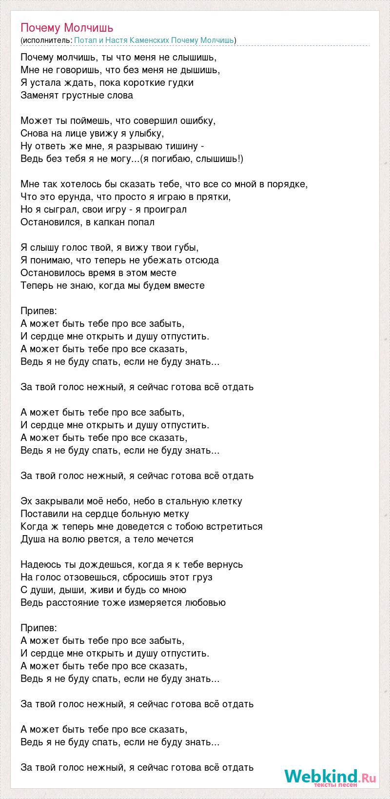 Почему молчишь, ты что меня не слышишь, Мне не говоришь, что без меня не дышишь, Я устала ждать, пока короткие гудки Заменят грустные слова Может ты поймешь, что совершил ошибку, Снова на лице увижу я улыбку, Ну ответь же мне, я разрываю тишину - Ведь без тебя я не могу...(я погибаю, слышишь!) Мне так хотелось бы сказать тебе, что все со мной в порядке, Что это ерунда, что просто я играю в прятки, Но я сыграл, свои игру - я проиграл Остановился, в капкан попал Я слышу голос твой, я вижу твои губы, Я понимаю, что теперь не убежать отсюда Остановилось время в этом месте Теперь не знаю, когда мы будем вместе Припев: А может быть тебе про все забыть, И сердце мне открыть и душу отпустить. А может быть тебе про все сказать, Ведь я не буду спать, если не буду знать... За твой голос нежный, я сейчас готова всё отдать А может быть тебе про все забыть, И сердце мне открыть и душу отпустить. А может быть тебе про все сказать, Ведь я не буду спать, если не буду знать... За твой голос нежный, я сейчас готова всё отдать Эх закрывали моё небо, небо в стальную клетку Поставили на сердце больную метку Когда ж теперь мне доведется с тобою встретиться Душа на волю рвется, а тело мечется Надеюсь ты дождешься, когда я к тебе вернусь На голос отзовешься, сбросишь этот груз С души, дыши, живи и будь со мною Ведь расстояние тоже измеряется любовью Припев: А может быть тебе про все забыть, И сердце мне открыть и душу отпустить. А может быть тебе про все сказать, Ведь я не буду спать, если не буду знать... За твой голос нежный, я сейчас готова всё отдать А может быть тебе про все сказать, Ведь я не буду спать, если не буду знать... За твой голос нежный, я сейчас готова всё отдать