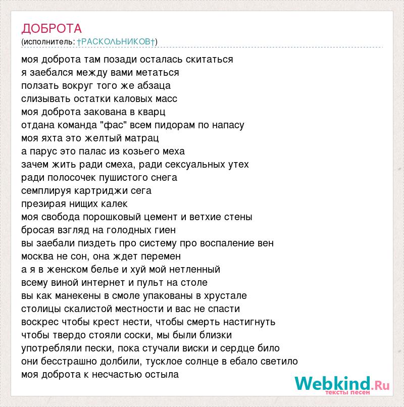 моя доброта там позади осталась скитаться я заебался между вами метаться ползать вокруг того же абзаца слизывать остатки каловых масс моя доброта закована в кварц отдана команда "фас" всем пидорам по напасу моя яхта это желтый матрац а парус это палас из козьего меха зачем жить ради смеха, ради сексуальных утех ради полосочек пушистого снега семплируя картриджи сега презирая нищих калек моя свобода порошковый цемент и ветхие стены бросая взгляд на голодных гиен вы заебали пиздеть про систему про воспаление вен москва не сон, она ждет перемен а я в женском белье и хуй мой нетленный всему виной интернет и пульт на столе вы как манекены в смоле упакованы в хрустале столицы скалистой местности и вас не спасти воскрес чтобы крест нести, чтобы смерть настигнуть чтобы твердо стояли соски, мы были близки употребляли пески, пока стучали виски и сердце било они бесстрашно долбили, тусклое солнце в ебало светило моя доброта к несчастью остыла