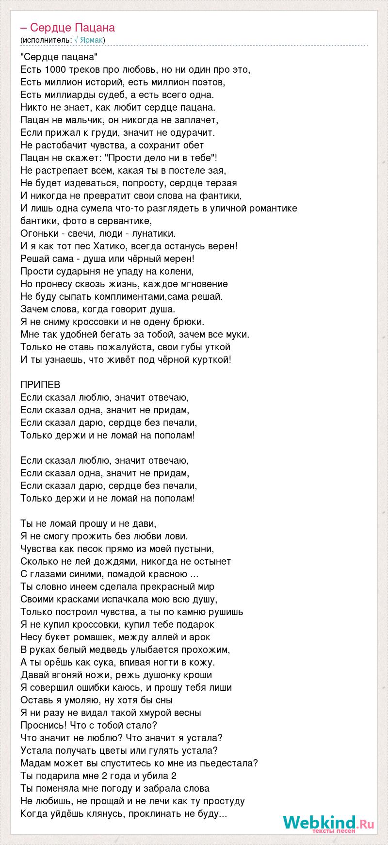"Сердце пацана" Есть 1000 треков про любовь, но ни один про это, Есть миллион историй, есть миллион поэтов, Есть миллиарды судеб, а есть всего одна. Никто не знает, как любит сердце пацана. Пацан не мальчик, он никогда не заплачет, Если прижал к груди, значит не одурачит. Не растобачит чувства, а сохранит обет Пацан не скажет: "Прости дело ни в тебе"! Не растрепает всем, какая ты в постеле зая, Не будет издеваться, попросту, сердце терзая И никогда не превратит свои слова на фантики, И лишь одна сумела что-то разглядеть в уличной романтике бантики, фото в сервантике, Огоньки - свечи, люди - лунатики. И я как тот пес Хатико, всегда останусь верен! Решай сама - душа или чёрный мерен! Прости сударыня не упаду на колени, Но пронесу сквозь жизнь, каждое мгновение Не буду сыпать комплиментами,сама решай. Зачем слова, когда говорит душа. Я не сниму кроссовки и не одену брюки. Мне так удобней бегать за тобой, зачем все муки. Только не ставь пожалуйста, свои губы уткой И ты узнаешь, что живёт под чёрной курткой! ПРИПЕВ Если сказал люблю, значит отвечаю, Если сказал одна, значит не придам, Если сказал дарю, сердце без печали, Только держи и не ломай на пополам! Если сказал люблю, значит отвечаю, Если сказал одна, значит не придам, Если сказал дарю, сердце без печали, Только держи и не ломай на пополам! Ты не ломай прошу и не дави, Я не смогу прожить без любви лови. Чувства как песок прямо из моей пустыни, Сколько не лей дождями, никогда не остынет С глазами синими, помадой красною ... Ты словно инеем сделала прекрасный мир Своими красками испачкала мою всю душу, Только построил чувства, а ты по камню рушишь Я не купил кроссовки, купил тебе подарок Несу букет ромашек, между аллей и арок В руках белый медведь улыбается прохожим, А ты орёшь как сука, впивая ногти в кожу. Давай вгоняй ножи, режь душонку кроши Я совершил ошибки каюсь, и прошу тебя лиши Оставь я умоляю, ну хотя бы сны Я ни разу не видал такой хмурой весны Проснись! Что с тобой стало? Что значит не люблю? Что значит я устала? Устала получать цветы или гулять устала? Мадам может вы спуститесь ко мне из пьедестала? Ты подарила мне 2 года и убила 2 Ты поменяла мне погоду и забрала слова Не любишь, не прощай и не лечи как ту простуду Когда уйдёшь клянусь, проклинать не буду...