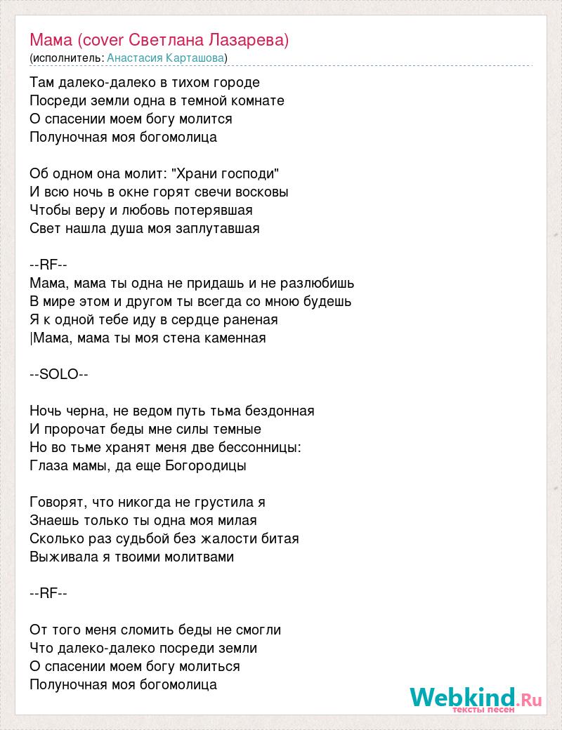 Там далеко-далеко в тихом городе Посреди земли одна в темной комнате О спасении моем богу молится Полуночная моя богомолица Об одном она молит: "Храни господи" И всю ночь в окне горят свечи восковы Чтобы веру и любовь потерявшая Свет нашла душа моя заплутавшая --RF-- Мама, мама ты одна не придашь и не разлюбишь В мире этом и другом ты всегда со мною будешь Я к одной тебе иду в сердце раненая |Мама, мама ты моя стена каменная --SOLO-- Ночь черна, не ведом путь тьма бездонная И пророчат беды мне силы темные Но во тьме хранят меня две бессонницы: Глаза мамы, да еще Богородицы Говорят, что никогда не грустила я Знаешь только ты одна моя милая Сколько раз судьбой без жалости битая Выживала я твоими молитвами --RF-- От того меня сломить беды не смогли Что далеко-далеко посреди земли О спасении моем богу молиться Полуночная моя богомолица
