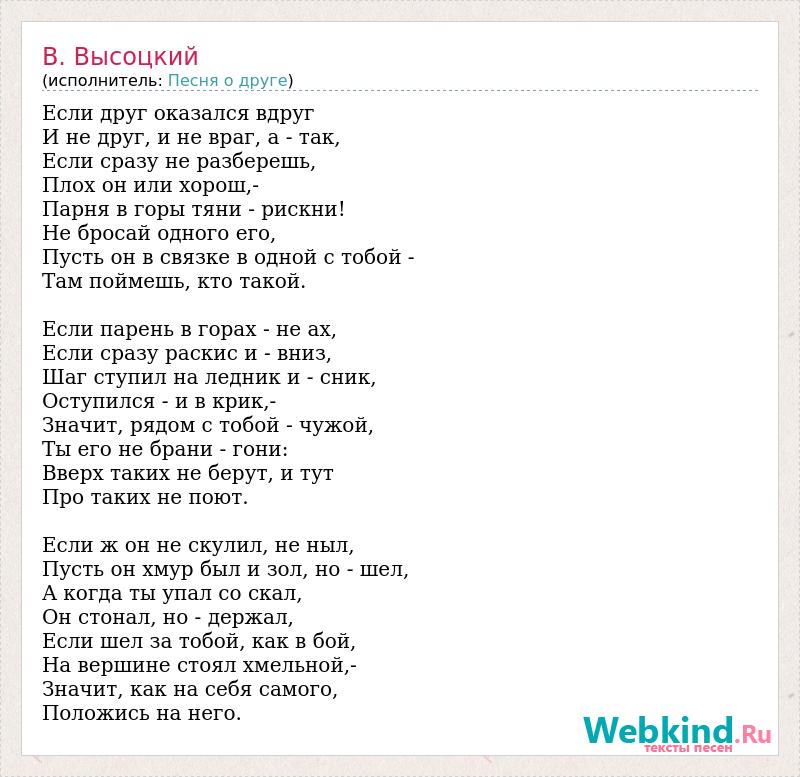 Если друг оказался вдруг И не друг, и не враг, а - так, Если сразу не разберешь, Плох он или хорош,- Парня в горы тяни - рискни! Не бросай одного его, Пусть он в связке в одной с тобой - Там поймешь, кто такой. Если парень в горах - не ах, Если сразу раскис и - вниз, Шаг ступил на ледник и - сник, Оступился - и в крик,- Значит, рядом с тобой - чужой, Ты его не брани - гони: Вверх таких не берут, и тут Про таких не поют. Если ж он не скулил, не ныл, Пусть он хмур был и зол, но - шел, А когда ты упал со скал, Он стонал, но - держал, Если шел за тобой, как в бой, На вершине стоял хмельной,- Значит, как на себя самого, Положись на него.