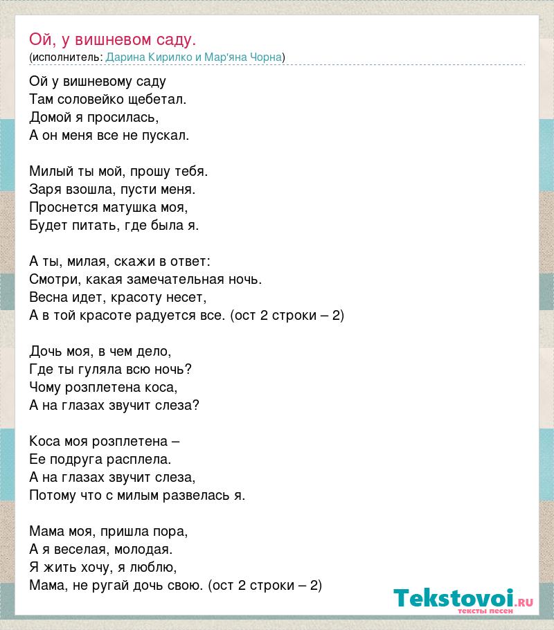 Ой у вишневому саду Там соловейко щебетал. Домой я просилась, А он меня все не пускал. Милый ты мой, прошу тебя. Заря взошла, пусти меня. Проснется матушка моя, Будет питать, где была я. А ты, милая, скажи в ответ: Смотри, какая замечательная ночь. Весна идет, красоту несет, А в той красоте радуется все. (ост 2 строки – 2) Дочь моя, в чем дело, Где ты гуляла всю ночь? Чому розплетена коса, А на глазах звучит слеза? Коса моя розплетена – Ее подруга расплела. А на глазах звучит слеза, Потому что с милым развелась я. Мама моя, пришла пора, А я веселая, молодая. Я жить хочу, я люблю, Мама, не ругай дочь свою. (ост 2 строки – 2)
