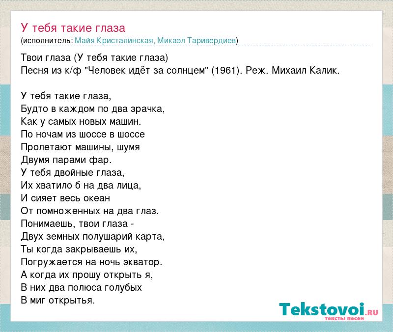 Твои глаза (У тебя такие глаза) Песня из к/ф "Человек идёт за солнцем" (1961). Реж. Михаил Калик. У тебя такие глаза, Будто в каждом по два зрачка, Как у самых новых машин. По ночам из шоссе в шоссе Пролетают машины, шумя Двумя парами фар. У тебя двойные глаза, Их хватило б на два лица, И сияет весь океан От помноженных на два глаз. Понимаешь, твои глаза - Двух земных полушарий карта, Ты когда закрываешь их, Погружается на ночь экватор. А когда их прошу открыть я, В них два полюса голубых В миг открытья.