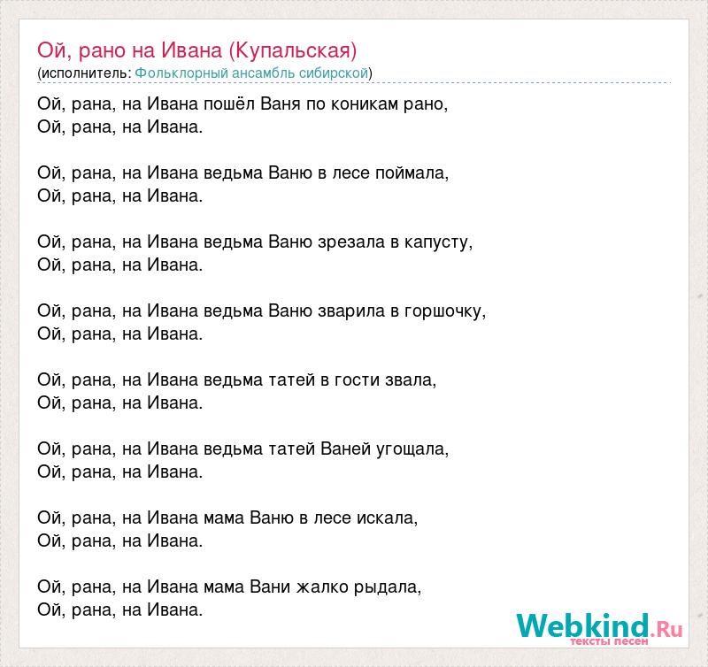 Ой, рана, на Ивана пошёл Ваня по коникам рано, Ой, рана, на Ивана. Ой, рана, на Ивана ведьма Ваню в лесе поймала, Ой, рана, на Ивана. Ой, рана, на Ивана ведьма Ваню зрезала в капусту, Ой, рана, на Ивана. Ой, рана, на Ивана ведьма Ваню зварила в горшочку, Ой, рана, на Ивана. Ой, рана, на Ивана ведьма татей в гости звала, Ой, рана, на Ивана. Ой, рана, на Ивана ведьма татей Ваней угощала, Ой, рана, на Ивана. Ой, рана, на Ивана мама Ваню в лесе искала, Ой, рана, на Ивана. Ой, рана, на Ивана мама Вани жалко рыдала, Ой, рана, на Ивана.