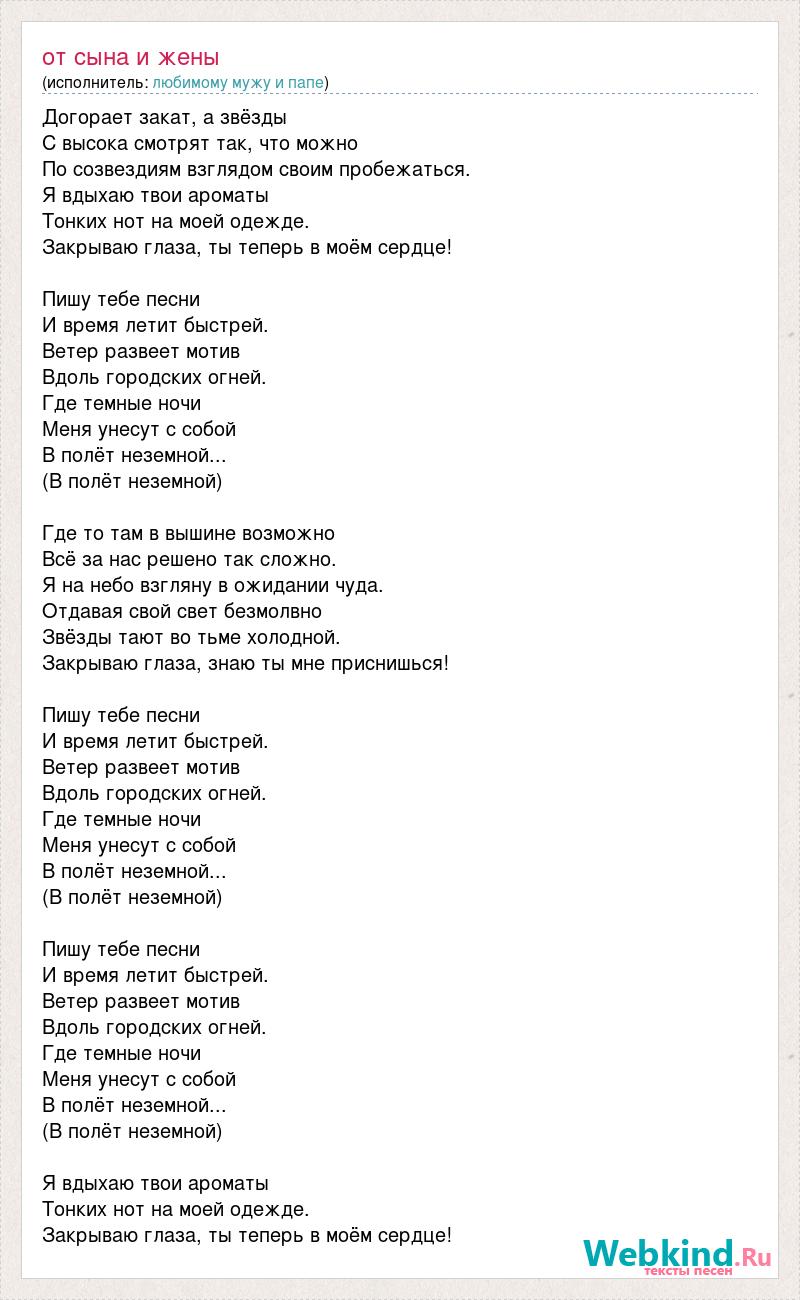 Догорает закат, а звёзды С высока смотрят так, что можно По созвездиям взглядом своим пробежаться. Я вдыхаю твои ароматы Тонких нот на моей одежде. Закрываю глаза, ты теперь в моём сердце! Пишу тебе песни И время летит быстрей. Ветер развеет мотив Вдоль городских огней. Где темные ночи Меня унесут с собой В полёт неземной... (В полёт неземной) Где то там в вышине возможно Всё за нас решено так сложно. Я на небо взгляну в ожидании чуда. Отдавая свой свет безмолвно Звёзды тают во тьме холодной. Закрываю глаза, знаю ты мне приснишься! Пишу тебе песни И время летит быстрей. Ветер развеет мотив Вдоль городских огней. Где темные ночи Меня унесут с собой В полёт неземной... (В полёт неземной) Пишу тебе песни И время летит быстрей. Ветер развеет мотив Вдоль городских огней. Где темные ночи Меня унесут с собой В полёт неземной... (В полёт неземной) Я вдыхаю твои ароматы Тонких нот на моей одежде. Закрываю глаза, ты теперь в моём сердце!