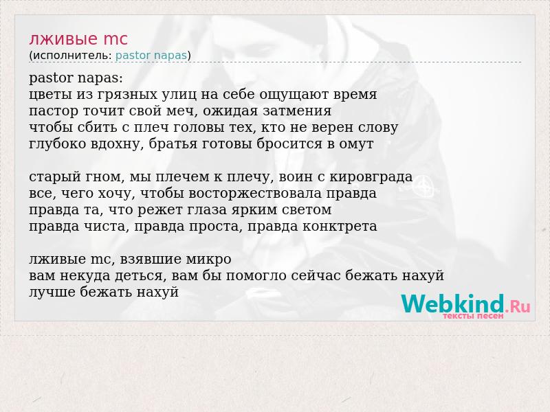 pastor napas: цветы из грязных улиц на себе ощущают время пастор точит свой меч, ожидая затмения чтобы сбить с плеч головы тех, кто не верен слову глубоко вдохну, братья готовы бросится в омут старый гном, мы плечем к плечу, воин с кировграда все, чего хочу, чтобы восторжествовала правда правда та, что режет глаза ярким светом правда чиста, правда проста, правда конктрета лживые mc, взявшие микро вам некуда деться, вам бы помогло сейчас бежать нахуй лучше бежать нахуй
