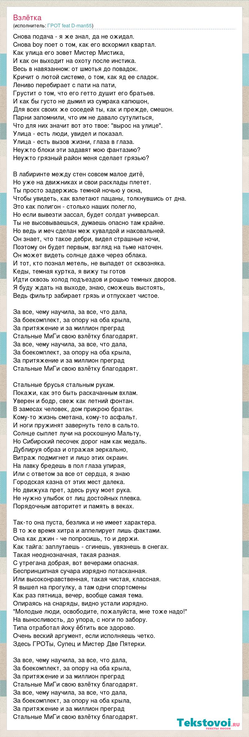 Снова подача - я же знал, да не ожидал. Снова boy поет о том, как его вскормил квартал. Как улица его зовет Мистер Мистика, И как он выходит на охоту после инстика. Весь в навязанном: от шмотья до повадок. Кричит о лютой системе, о том, как яд ее сладок. Лениво перебирает с пати на пати, Грустит о том, что его гетто душит его братьев. И как бы густо не дымил из сумрака капюшон, Для всех своих же соседей ты, как и прежде, смешон. Парни запомнили, что им не давало сутулиться, Что для них значит вот это твое: "вырос на улице". Улица - есть люди, увидел и показал. Улица - есть вызов жизни, глаза в глаза. Неужто блоки эти задавят мою фантазию? Неужто грязный район меня сделает грязью? В лабиринте между стен совсем малое дитё, Но уже на движниках и свои расклады плетет. Ты просто задержись темной ночью у окна, Чтобы увидеть, как взлетают пацаны, толкнувшись от дна. Это как полигон - столько наших полегло, Но если вывезти зассал, будет солдат универсал. Ты не высовываешься, думаешь опасно там крайне. Но ведь и меч сделан меж кувалдой и наковальней. Он знает, что такое дебри, видел страшные ночи, Поэтому он будет первым, взгляд на тьме наточен. Он может видеть солнце даже через облака. И тот, кто познал метель, не выпадет от сквозняка. Кеды, темная куртка, я вижу ты готов Идти сквозь холод подъездов и рощью темных дворов. Я буду ждать на выходе, знаю, сможешь выстоять, Ведь фильтр забирает грязь и отпускает чистое. За все, чему научила, за все, что дала, За боекомплект, за опору на оба крыла, За притяжение и за миллион преград Стальные МиГи свою взлётку благодарят. За все, чему научила, за все, что дала, За боекомплект, за опору на оба крыла, За притяжение и за миллион преград Стальные МиГи свою взлётку благодарят. Стальные брусья стальным рукам. Покажи, как это быть раскачанным вхлам. Уверен и бодр, свеж как летний фонтан. В замесах человек, дом прикрою братан. Кому-то жизнь сметана, кому-то асфальт. И ноги пружинят завернуть тело в сальто. Солнце сыплет лучи на роскошную Мальту, Но Сибирский песочек дорог нам как медаль. Дублируя образ и отражая зеркально, Витраж подмигнет и лицо этих окраин. На лавку бредешь в пол глаза упирая, Или с ответом за все от сердца, я знаю Городская казна от этих мест далека. Но движуха прет, здесь руку моет рука. Не нужно улыбок от лиц достойных плевка. Порядочным авторитет и память в веках. Так-то она пуста, безлика и не имеет характера. В то же время хитра и аппелирует лишь фактами. Она как джин - че попросишь, то и держи. Как тайга: заплутаешь - сгинешь, увязнешь в снегах. Такая неоднозначная, такая разная. С утрегана добрая, вот вечерами опасная. Беспринципная сучара изрядно потасканная. Или высоконравственная, такая чистая, классная. Я вышел на прогулку, а там одни спортсмены Как раз пятница, вечер, вообще самая тема. Опираясь на снаряды, видно устали изрядно. "Молодые люди, освободите, пожалуйста, мне тоже надо!" На выносливость, до упора, с ноги по забору. Типа отработал йоку ёбтить все здорово. Очень веский аргумент, если исполняешь четко. Здесь ГРОТы, Супец и Мистер Две Пятерки. За все, чему научила, за все, что дала, За боекомплект, за опору на оба крыла, За притяжение и за миллион преград Стальные МиГи свою взлётку благодарят. За все, чему научила, за все, что дала, За боекомплект, за опору на оба крыла, За притяжение и за миллион преград Стальные МиГи свою взлёт