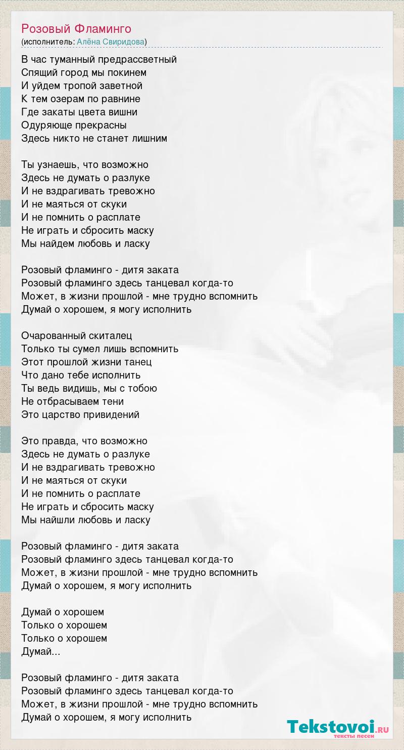 В час туманный предрассветный Спящий город мы покинем И уйдем тропой заветной К тем озерам по равнине Где закаты цвета вишни Одуряюще прекрасны Здесь никто не станет лишним Ты узнаешь, что возможно Здесь не думать о разлуке И не вздрагивать тревожно И не маяться от скуки И не помнить о расплате Не играть и сбросить маску Мы найдем любовь и ласку Розовый фламинго - дитя заката Розовый фламинго здесь танцевал когда-то Может, в жизни прошлой - мне трудно вспомнить Думай о хорошем, я могу исполнить Очарованный скиталец Только ты сумел лишь вспомнить Этот прошлой жизни танец Что дано тебе исполнить Ты ведь видишь, мы с тобою Не отбрасываем тени Это царство привидений Это правда, что возможно Здесь не думать о разлуке И не вздрагивать тревожно И не маяться от скуки И не помнить о расплате Не играть и сбросить маску Мы найшли любовь и ласку Розовый фламинго - дитя заката Розовый фламинго здесь танцевал когда-то Может, в жизни прошлой - мне трудно вспомнить Думай о хорошем, я могу исполнить Думай о хорошем Только о хорошем Только о хорошем Думай... Розовый фламинго - дитя заката Розовый фламинго здесь танцевал когда-то Может, в жизни прошлой - мне трудно вспомнить Думай о хорошем, я могу исполнить