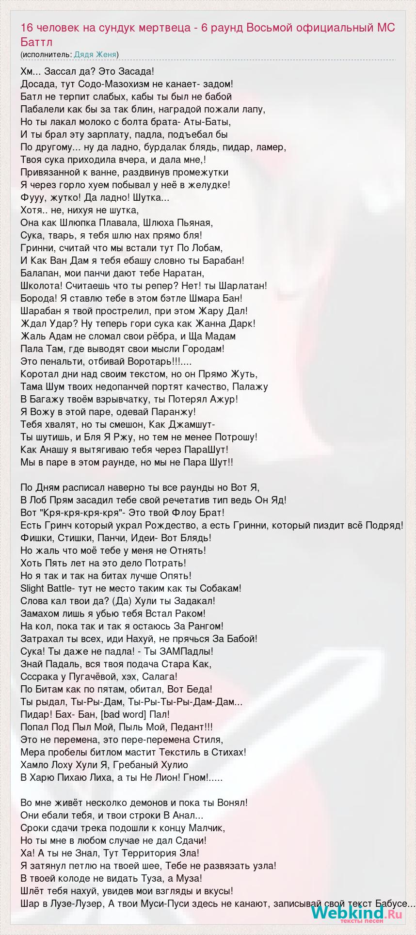 Хм... Зассал да? Это Засада! Досада, тут Содо-Мазохизм не канает- задом! Батл не терпит слабых, кабы ты был не бабой Пабалели как бы за так блин, наградой пожали лапу, Но ты лакал молоко с болта брата- Аты-Баты, И ты брал эту зарплату, падла, подъебал бы По другому... ну да ладно, бурдалак блядь, пидар, ламер, Твоя сука приходила вчера, и дала мне,! Привязанной к ванне, раздвинув промежутки Я через горло хуем побывал у неё в желудке! Фууу, жутко! Да ладно! Шутка... Хотя.. не, нихуя не шутка, Она как Шлюпка Плавала, Шлюха Пьяная, Сука, тварь, я тебя шлю нах прямо бля! Гринни, считай что мы встали тут По Лобам, И Как Ван Дам я тебя ебашу словно ты Барабан! Балапан, мои панчи дают тебе Наратан, Школота! Считаешь что ты репер? Нет! ты Шарлатан! Борода! Я ставлю тебе в этом бэтле Шмара Бан! Шарабан я твой прострелил, при этом Жару Дал! Ждал Удар? Ну теперь гори сука как Жанна Дарк! Жаль Адам не сломал свои рёбра, и Ща Мадам Пала Там, где выводят свои мысли Городам! Это пенальти, отбивай Воротарь!!!.... Коротал дни над своим текстом, но он Прямо Жуть, Тама Шум твоих недопанчей портят качество, Палажу В Багажу твоём взрывчатку, ты Потерял Ажур! Я Вожу в этой паре, одевай Паранжу! Тебя хвалят, но ты смешон, Как Джамшут- Ты шутишь, и Бля Я Ржу, но тем не менее Потрошу! Как Анашу я вытягиваю тебя через ПараШут! Мы в паре в этом раунде, но мы не Пара Шут!! По Дням расписал наверно ты все раунды но Вот Я, В Лоб Прям засадил тебе свой речетатив тип ведь Он Яд! Вот "Кря-кря-кря-кря"- Это твой Флоу Брат! Есть Гринч который украл Рождество, а есть Гринни, который пиздит всё Подряд! Фишки, Стишки, Панчи, Идеи- Вот Блядь! Но жаль что моё тебе у меня не Отнять! Хоть Пять лет на это дело Потрать! Но я так и так на битах лучше Опять! Slight Battle- тут не место таким как ты Собакам! Слова кал твои да? (Да) Хули ты Задакал! Замахом лишь я убью тебя Встал Раком! На кол, пока так и так я остаюсь За Рангом! Затрахал ты всех, иди Нахуй, не прячься За Бабой! Сука! Ты даже не падла! - Ты ЗАМПадлы! Знай Падаль, вся твоя подача Стара Как, Сссрака у Пугачёвой, хэх, Салага! По Битам как по пятам, обитал, Вот Беда! Ты рыдал, Ты-Ры-Дам, Ты-Ры-Ты-Ры-Дам-Дам... Пидар! Бах- Бан, [bad word] Пал! Попал Под Пыл Мой, Пыль Мой, Педант!!! Это не перемена, это пере-перемена Стиля, Мера пробелы битлом мастит Текстиль в Стихах! Хамло Лоху Хули Я, Гребаный Хулио В Харю Пихаю Лиха, а ты Не Лион! Гном!..... Во мне живёт несколко демонов и пока ты Вонял! Они ебали тебя, и твои строки В Анал... Сроки сдачи трека подошли к концу Малчик, Но ты мне в любом случае не дал Сдачи! Ха! А ты не Знал, Тут Территория Зла! Я затянул петлю на твоей шее, Тебе не развязать узла! В твоей колоде не видать Туза, а Муза! Шлёт тебя нахуй, увидев мои взгляды и вкусы! Шар в Лузе-Лузер, А твои Муси-Пуси здесь не канают, записывай свой текст Бабусе...