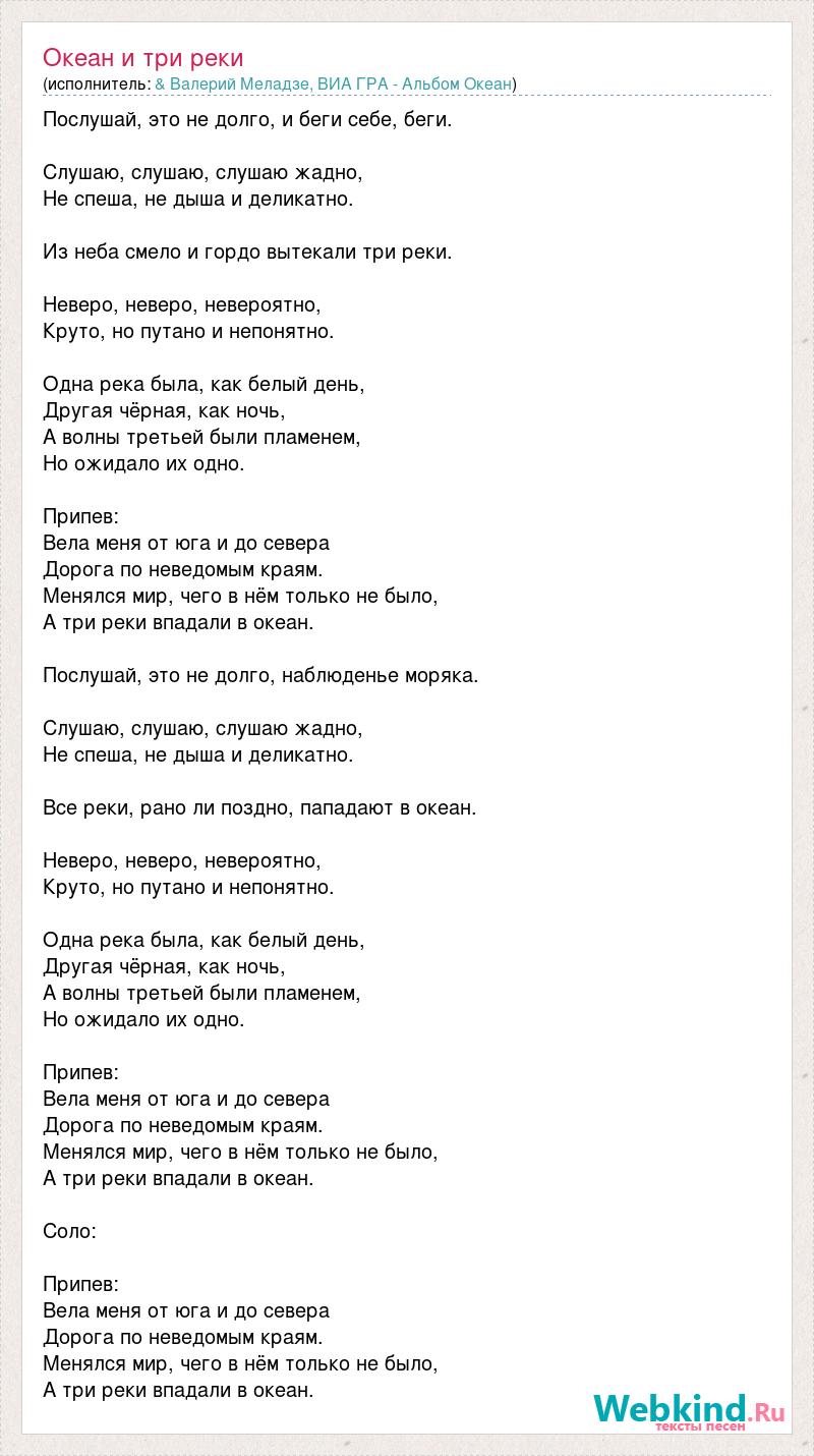 Послушай, это не долго, и беги себе, беги. Слушаю, слушаю, слушаю жадно, Не спеша, не дыша и деликатно. Из неба смело и гордо вытекали три реки. Неверо, неверо, невероятно, Круто, но путано и непонятно. Одна река была, как белый день, Другая чёрная, как ночь, А волны третьей были пламенем, Но ожидало их одно. Припев: Вела меня от юга и до севера Дорога по неведомым краям. Менялся мир, чего в нём только не было, А три реки впадали в океан. Послушай, это не долго, наблюденье моряка. Слушаю, слушаю, слушаю жадно, Не спеша, не дыша и деликатно. Все реки, рано ли поздно, пападают в океан. Неверо, неверо, невероятно, Круто, но путано и непонятно. Одна река была, как белый день, Другая чёрная, как ночь, А волны третьей были пламенем, Но ожидало их одно. Припев: Вела меня от юга и до севера Дорога по неведомым краям. Менялся мир, чего в нём только не было, А три реки впадали в океан. Соло: Припев: Вела меня от юга и до севера Дорога по неведомым краям. Менялся мир, чего в нём только не было, А три реки впадали в океан.