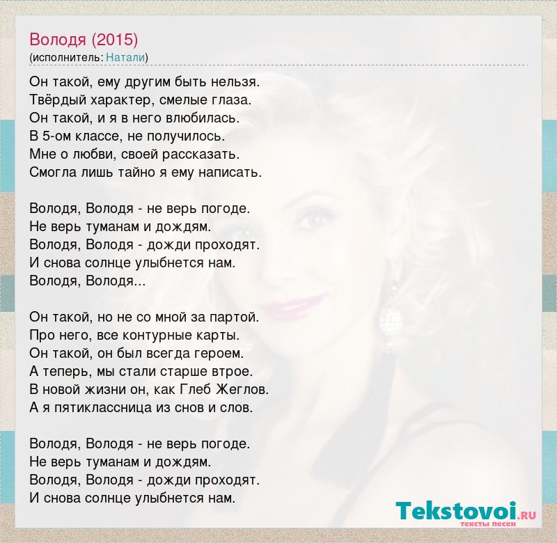 Он такой, ему другим быть нельзя. Твёрдый характер, смелые глаза. Он такой, и я в него влюбилась. В 5-ом классе, не получилось. Мне о любви, своей рассказать. Смогла лишь тайно я ему написать. Володя, Володя - не верь погоде. Не верь туманам и дождям. Володя, Володя - дожди проходят. И снова солнце улыбнется нам. Володя, Володя... Он такой, но не со мной за партой. Про него, все контурные карты. Он такой, он был всегда героем. А теперь, мы стали старше втрое. В новой жизни он, как Глеб Жеглов. А я пятиклассница из снов и слов. Володя, Володя - не верь погоде. Не верь туманам и дождям. Володя, Володя - дожди проходят. И снова солнце улыбнется нам.