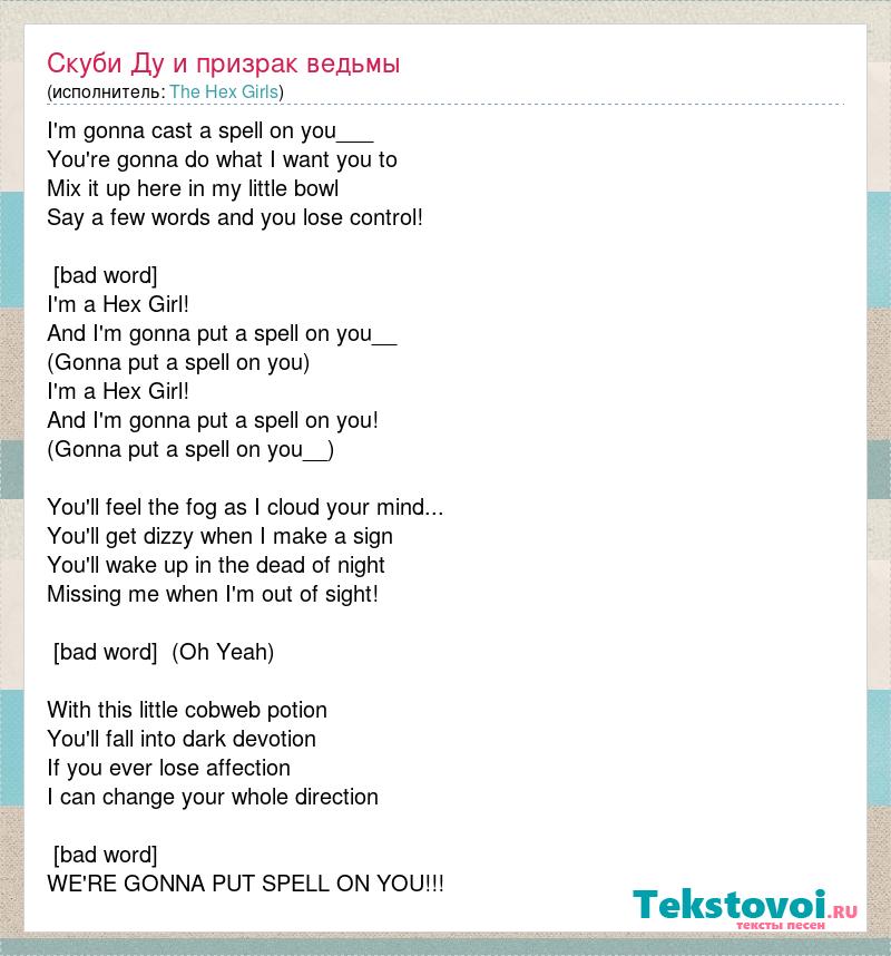 I'm gonna cast a spell on you___ You're gonna do what I want you to Mix it up here in my little bowl Say a few words and you lose control! [bad word] I'm a Hex Girl! And I'm gonna put a spell on you__ (Gonna put a spell on you) I'm a Hex Girl! And I'm gonna put a spell on you! (Gonna put a spell on you__) You'll feel the fog as I cloud your mind... You'll get dizzy when I make a sign You'll wake up in the dead of night Missing me when I'm out of sight! [bad word] (Oh Yeah) With this little cobweb potion You'll fall into dark devotion If you ever lose affection I can change your whole direction [bad word] WE'RE GONNA PUT SPELL ON YOU!!!