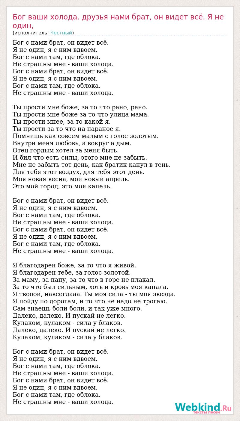Бог с нами брат, он видет всё. Я не один, я с ним вдвоем. Бог с нами там, где облока. Не страшны мне - ваши холода. Бог с нами брат, он видет всё. Я не один, я с ним вдвоем. Бог с нами там, где облока. Не страшны мне - ваши холода. Ты прости мне боже, за то что рано, рано. Ты прости мне боже за то что улица мама. Ты прости мнее, за то какой я. Ты прости за то что на параное я. Помнишь как совсем малым с голос золотым. Внутри меня любовь, а вокруг а дым. Отец гордым хотел за меня быть. И бил что есть силы, этого мне не забыть. Мне не забыть тот день, как братик канул в тень. Для тебя этот воздух, для тебя этот день. Моя новая весна, мой новый апрель. Это мой город, это моя капель. Бог с нами брат, он видет всё. Я не один, я с ним вдвоем. Бог с нами там, где облока. Не страшны мне - ваши холода. Бог с нами брат, он видет всё. Я не один, я с ним вдвоем. Бог с нами там, где облока. Не страшны мне - ваши холода. Я благодарен боже, за то что я живой. Я благодарен тебе, за голос золотой. За маму, за папу, за то что в горе не плакал. За то что был сильным, хоть и кровь моя капала. Я твооой, навсегдааа. Ты моя сила - ты моя звезда. Я пойду по дорогам, и то что не надо не трогаю. Сам знаешь боли боли, и так уже много. Далеко, далеко. И пускай не легко. Кулаком, кулаком - сила у блаков. Далеко, далеко. И пускай не легко. Кулаком, кулаком - сила у блаков. Бог с нами брат, он видет всё. Я не один, я с ним вдвоем. Бог с нами там, где облока. Не страшны мне - ваши холода. Бог с нами брат, он видет всё. Я не один, я с ним вдвоем. Бог с нами там, где облока. Не страшны мне - ваши холода.