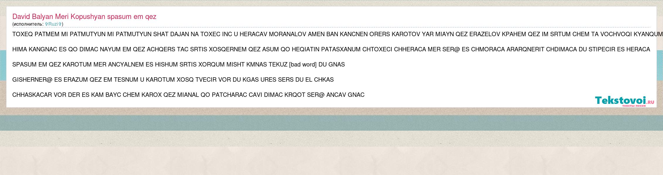 А как ты думаешь, о чем песня "David Balyan Meri Kopushyan spasum em qez" ?