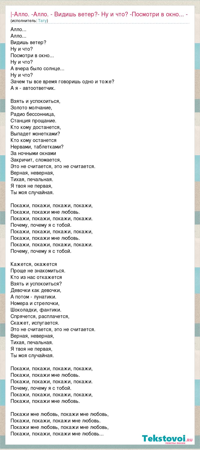 Алло... Алло... Видишь ветер? Ну и что? Посмотри в окно... Ну и что? А вчера было солнце... Ну и что? Зачем ты все время говоришь одно и тоже? А я - автоответчик. Взять и успокоиться, Золото молчание, Радио бессонница, Станция прощание. Кто кому достанется, Выпадет монетками? Кто кому останется Нервами, таблетками? За ночными окнами Закричит, сломается, Это не считается, это не считается. Верная, неверная, Тихая, печальная. Я твоя не первая, Ты моя случайная. Покажи, покажи, покажи, покажи, Покажи, покажи мне любовь. Покажи, покажи, покажи, покажи. Почему, почему я с тобой. Покажи, покажи, покажи, покажи, Покажи, покажи мне любовь. Покажи, покажи, покажи, покажи. Почему, почему я с тобой. Кажется, окажется Проще не знакомиться. Кто из нас откажется Взять и успокоиться? Девочки как девочки, А потом - лунатики. Номера и стрелочки, Шоколадки, фантики. Спрячется, расплачется, Скажет, испугается. Это не считается, это не считается. Верная, неверная, Тихая, печальная. Я твоя не первая, Ты моя случайная. Покажи, покажи, покажи, покажи, Покажи, покажи мне любовь. Покажи, покажи, покажи, покажи. Почему, почему я с тобой. Покажи, покажи, покажи, покажи, Покажи, покажи мне любовь. Покажи мне любовь, покажи мне любовь, Покажи, покажи, покажи мне любовь. Покажи мне любовь, покажи мне любовь, Покажи, покажи, покажи мне любовь...
