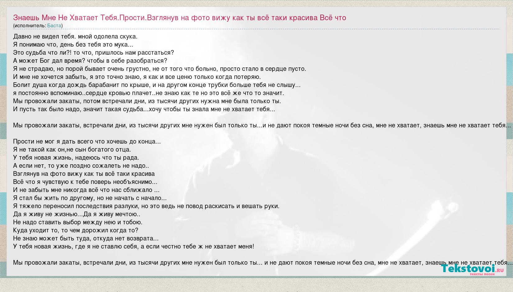 Главная→Исполнители→Баста→Знаешь Мне Не Хватает Тебя.Прости.Взглянув на фото вижу как ты всё таки красив