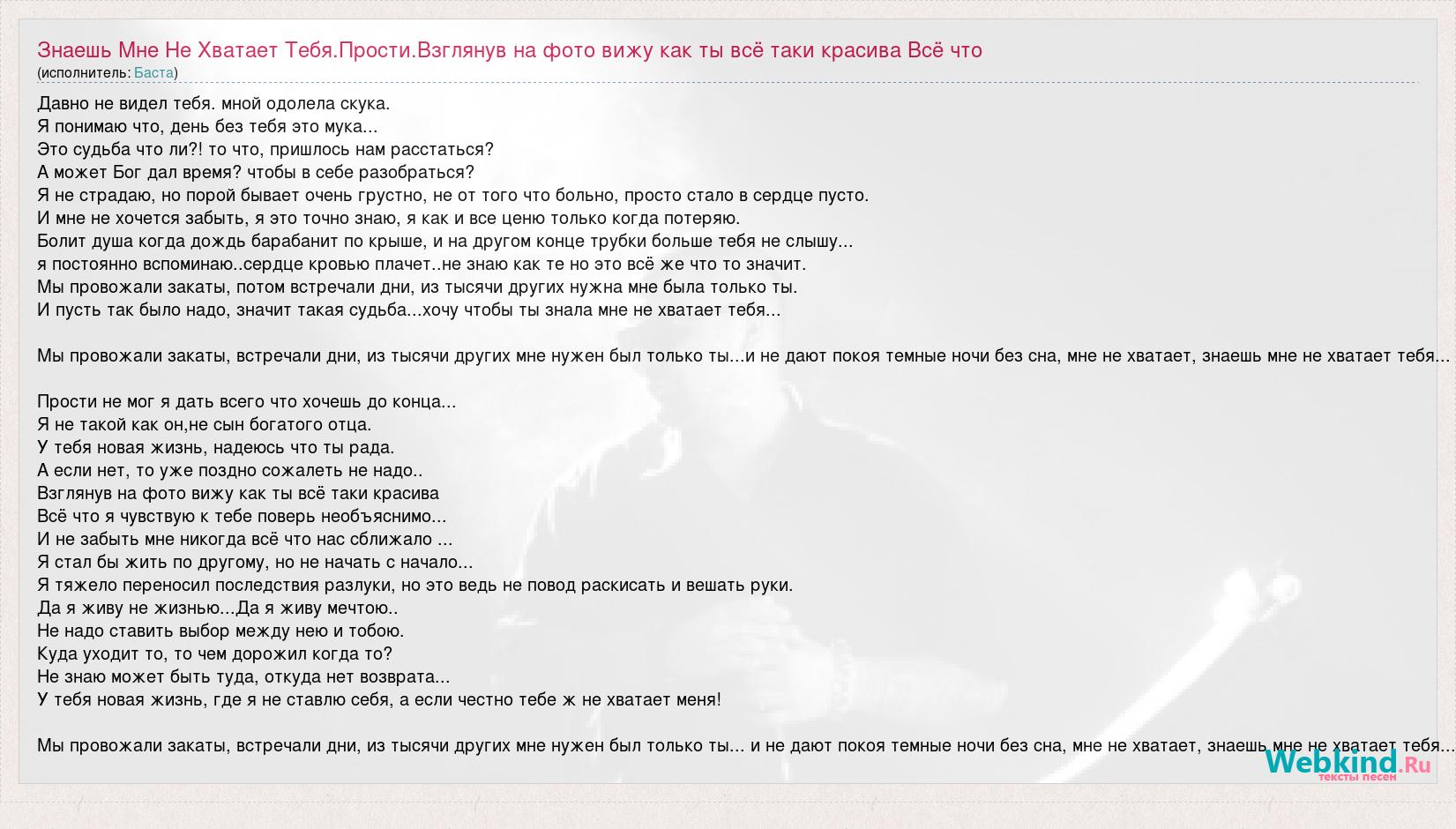 Главная→Исполнители→Баста→Знаешь Мне Не Хватает Тебя.Прости.Взглянув на фото вижу как ты всё таки красив
