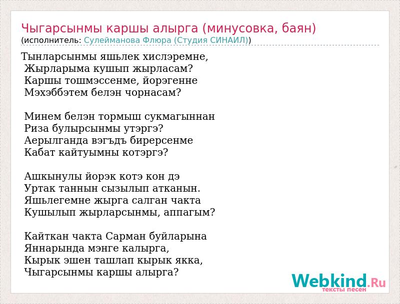 Тынларсынмы яшьлек хислэремне, Жырларыма кушып жырласам? Каршы тошмэссенме, йорэгенне Мэхэббэтем белэн чорнасам? Минем белэн тормыш сукмагыннан Риза булырсынмы утэргэ? Аерылганда вэгъдъ бирерсенме Кабат кайтуымны котэргэ? Ашкынулы йорэк котэ кон дэ Уртак таннын сызылып атканын. Яшьлегемне жырга салган чакта Кушылып жырларсынмы, аппагым? Кайткан чакта Сарман буйларына Яннарында мэнге калырга, Кырык эшен ташлап кырык якка, Чыгарсынмы каршы алырга?