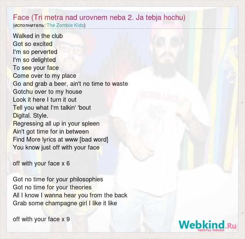 Walked in the club Got so excited I'm so perverted I'm so delighted To see your face Come over to my place Go and grab a beer, ain't no time to waste Gotchu over to my house Look it here I turn it out Tell you what I'm talkin' 'bout Digital. Style. Regressing all up in your spleen Ain't got time for in between Find More lyrics at www [bad word] You know just off with your face off with your face x 6 Got no time for your philosophies Got no time for your theories All I know I wanna hear you from the back Grab some champagne girl I like it like off with your face x 9