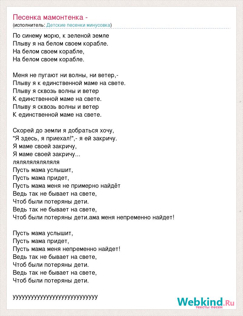 По синему морю, к зеленой земле Плыву я на белом своем корабле. На белом своем корабле, На белом своем корабле. Меня не пугают ни волны, ни ветер,- Плыву я к единственной маме на свете. Плыву я сквозь волны и ветер К единственной маме на свете. Плыву я сквозь волны и ветер К единственной маме на свете. Скорей до земли я добраться хочу, "Я здесь, я приехал!",- я ей закричу. Я маме своей закричу, Я маме своей закричу... ляляляляляляля Пусть мама услышит, Пусть мама придет, Пусть мама меня не примерно найдёт Ведь так не бывает на свете, Чтоб были потеряны дети. Ведь так не бывает на свете, Чтоб были потеряны дети.ама меня непременно найдет! Пусть мама услышит, Пусть мама придет, Пусть мама меня непременно найдет! Ведь так не бывает на свете, Чтоб были потеряны дети. Ведь так не бывает на свете, Чтоб были потеряны дети. уууууууууууууууууууууууууууу