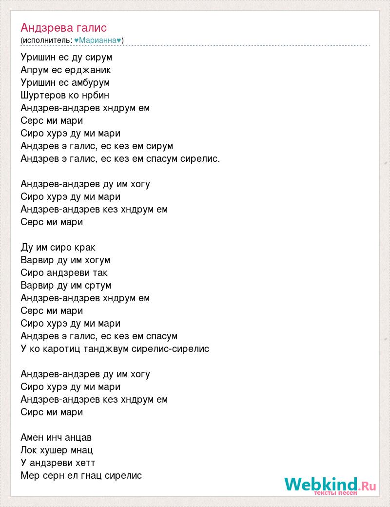 Уришин ес ду сирум Апрум ес ерджаник Уришин ес амбурум Шуртеров ко нрбин Андзрев-андзрев хндрум ем Серс ми мари Сиро хурэ ду ми мари Андзрев э галис, ес кез ем сирум Андзрев э галис, ес кез ем спасум сирелис. Андзрев-андзрев ду им хогу Сиро хурэ ду ми мари Андзрев-андзрев кез хндрум ем Серс ми мари Ду им сиро крак Варвир ду им хогум Сиро андзреви так Варвир ду им сртум Андзрев-андзрев хндрум ем Серс ми мари Сиро хурэ ду ми мари Андзрев э галис, ес кез ем спасум У ко каротиц танджвум сирелис-сирелис Андзрев-андзрев ду им хогу Сиро хурэ ду ми мари Андзрев-андзрев кез хндрум ем Сирс ми мари Амен инч анцав Лок хушер мнац У андзреви хетт Мер серн ел гнац сирелис