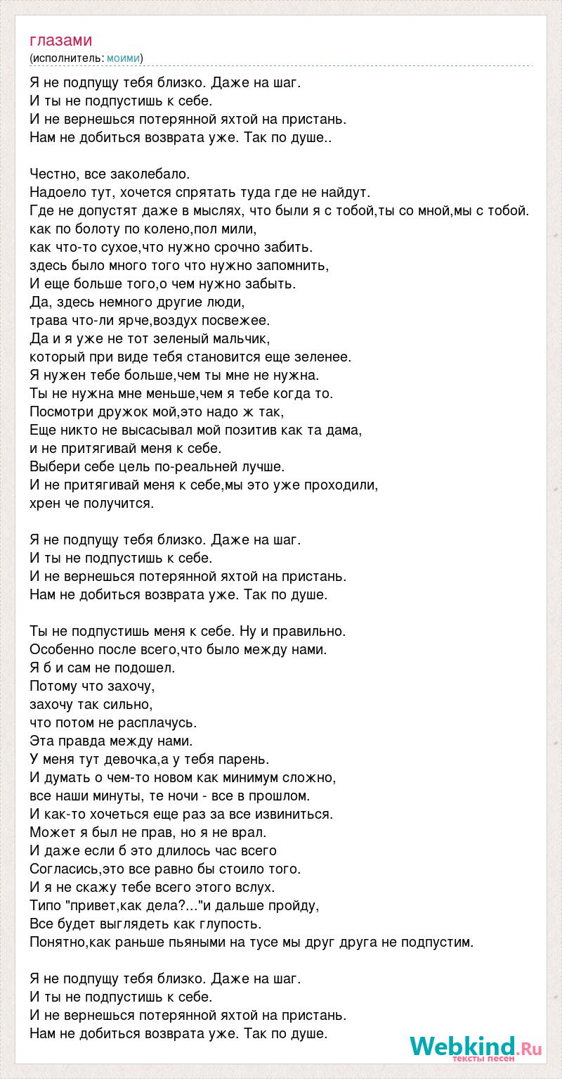 Я не подпущу тебя близко. Даже на шаг. И ты не подпустишь к себе. И не вернешься потерянной яхтой на пристань. Нам не добиться возврата уже. Так по душе.. Честно, все заколебало. Надоело тут, хочется спрятать туда где не найдут. Где не допустят даже в мыслях, что были я с тобой,ты со мной,мы с тобой. как по болоту по колено,пол мили, как что-то сухое,что нужно срочно забить. здесь было много того что нужно запомнить, И еще больше того,о чем нужно забыть. Да, здесь немного другие люди, трава что-ли ярче,воздух посвежее. Да и я уже не тот зеленый мальчик, который при виде тебя становится еще зеленее. Я нужен тебе больше,чем ты мне не нужна. Ты не нужна мне меньше,чем я тебе когда то. Посмотри дружок мой,это надо ж так, Еще никто не высасывал мой позитив как та дама, и не притягивай меня к себе. Выбери себе цель по-реальней лучше. И не притягивай меня к себе,мы это уже проходили, хрен че получится. Я не подпущу тебя близко. Даже на шаг. И ты не подпустишь к себе. И не вернешься потерянной яхтой на пристань. Нам не добиться возврата уже. Так по душе. Ты не подпустишь меня к себе. Ну и правильно. Особенно после всего,что было между нами. Я б и сам не подошел. Потому что захочу, захочу так сильно, что потом не расплачусь. Эта правда между нами. У меня тут девочка,а у тебя парень. И думать о чем-то новом как минимум сложно, все наши минуты, те ночи - все в прошлом. И как-то хочеться еще раз за все извиниться. Может я был не прав, но я не врал. И даже если б это длилось час всего Согласись,это все равно бы стоило того. И я не скажу тебе всего этого вслух. Типо "привет,как дела?..."и дальше пройду, Все будет выглядеть как глупость. Понятно,как раньше пьяными на тусе мы друг друга не подпустим. Я не подпущу тебя близко. Даже на шаг. И ты не подпустишь к себе. И не вернешься потерянной яхтой на пристань. Нам не добиться возврата уже. Так по душе.