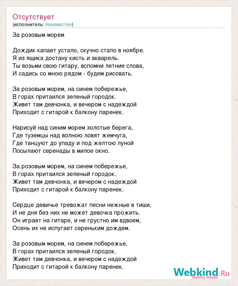 За розовым морем Дождик капает устало, скучно стало в ноябре. Я из ящика достану кисть и акварель. Ты возьми свою гитару, вспомни летние слова, И садись со мною рядом - будем рисовать. За розовым морем, на синем побережье, В горах притаился зеленый городок. Живет там девчонка, и вечером с надеждой Приходит с гитарой к балкону паренек. Нарисуй над синим морем золотые берега, Где туземцы над волною ловят жемчуга, Где танцуют до упаду и под желтою луной Посылают серенады в милое окно. За розовым морем, на синем побережье, В горах притаился зеленый городок. Живет там девчонка, и вечером с надеждой Приходит с гитарой к балкону паренек. Сердце девичье тревожат песни нежные в тиши, И не дня без них не может девочка прожить. Он играет на гитаре, и не грустно им вдвоем, Осень их не испугает сереньким дождем. За розовым морем, на синем побережье, В горах притаился зеленый городок. Живет там девчонка, и вечером с надеждой Приходит с гитарой к балкону паренек.