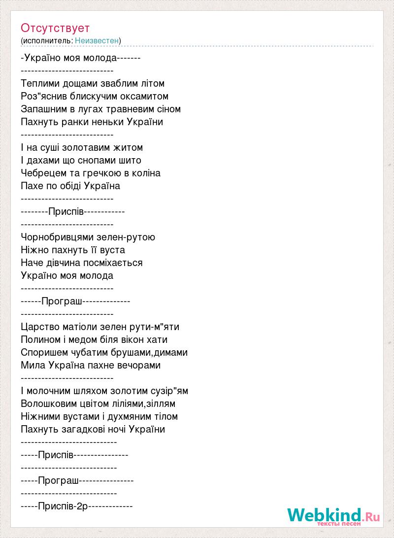-Україно моя молода------- --------------------------- Теплими дощами зваблим літом Роз"яснив блискучим оксамитом Запашним в лугах травневим сіном Пахнуть ранки неньки України --------------------------- І на суші золотавим житом І дахами що снопами шито Чебрецем та гречкою в коліна Пахе по обіді Україна --------------------------- --------Приспів------------ --------------------------- Чорнобривцями зелен-рутою Ніжно пахнуть її вуста Наче дівчина посміхається Україно моя молода --------------------------- ------Програш-------------- --------------------------- Царство матіоли зелен рути-м"яти Полином і медом біля вікон хати Споришем чубатим брушами,димами Мила Україна пахне вечорами --------------------------- І молочним шляхом золотим сузір"ям Волошковим цвітом ліліями,зіллям Ніжними вустами і духмяним тілом Пахнуть загадкові ночі України ---------------------------- -----Приспів---------------- ---------------------------- -----Програш---------------- ---------------------------- -----Приспів-2р-------------