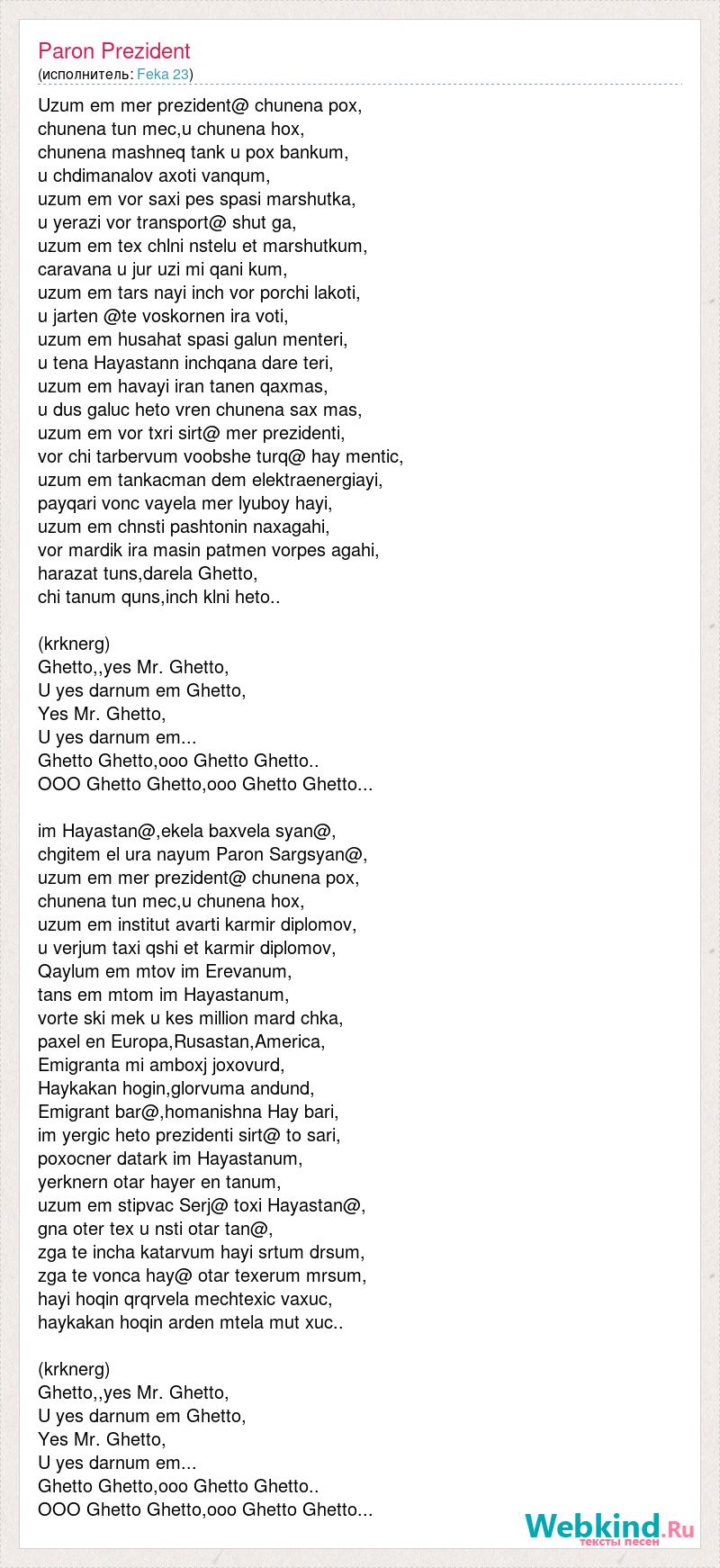 Uzum em mer prezident@ chunena pox, chunena tun mec,u chunena hox, chunena mashneq tank u pox bankum, u chdimanalov axoti vanqum, uzum em vor saxi pes spasi marshutka, u yerazi vor transport@ shut ga, uzum em tex chlni nstelu et marshutkum, caravana u jur uzi mi qani kum, uzum em tars nayi inch vor porchi lakoti, u jarten @te voskornen ira voti, uzum em husahat spasi galun menteri, u tena Hayastann inchqana dare teri, uzum em havayi iran tanen qaxmas, u dus galuc heto vren chunena sax mas, uzum em vor txri sirt@ mer prezidenti, vor chi tarbervum voobshe turq@ hay mentic, uzum em tankacman dem elektraenergiayi, payqari vonc vayela mer lyuboy hayi, uzum em chnsti pashtonin naxagahi, vor mardik ira masin patmen vorpes agahi, harazat tuns,darela Ghetto, chi tanum quns,inch klni heto.. (krknerg) Ghetto,,yes Mr. Ghetto, U yes darnum em Ghetto, Yes Mr. Ghetto, U yes darnum em... Ghetto Ghetto,ooo Ghetto Ghetto.. OOO Ghetto Ghetto,ooo Ghetto Ghetto... im Hayastan@,ekela baxvela syan@, chgitem el ura nayum Paron Sargsyan@, uzum em mer prezident@ chunena pox, chunena tun mec,u chunena hox, uzum em institut avarti karmir diplomov, u verjum taxi qshi et karmir diplomov, Qaylum em mtov im Erevanum, tans em mtom im Hayastanum, vorte ski mek u kes million mard chka, paxel en Europa,Rusastan,America, Emigranta mi amboxj joxovurd, Haykakan hogin,glorvuma andund, Emigrant bar@,homanishna Hay bari, im yergic heto prezidenti sirt@ to sari, poxocner datark im Hayastanum, yerknern otar hayer en tanum, uzum em stipvac Serj@ toxi Hayastan@, gna oter tex u nsti otar tan@, zga te incha katarvum hayi srtum drsum, zga te vonca hay@ otar texerum mrsum, hayi hoqin qrqrvela mechtexic vaxuc, haykakan hoqin arden mtela mut xuc.. (krknerg) Ghetto,,yes Mr. Ghetto, U yes darnum em Ghetto, Yes Mr. Ghetto, U yes darnum em... Ghetto Ghetto,ooo Ghetto Ghetto.. OOO Ghetto Ghetto,ooo Ghetto Ghetto...