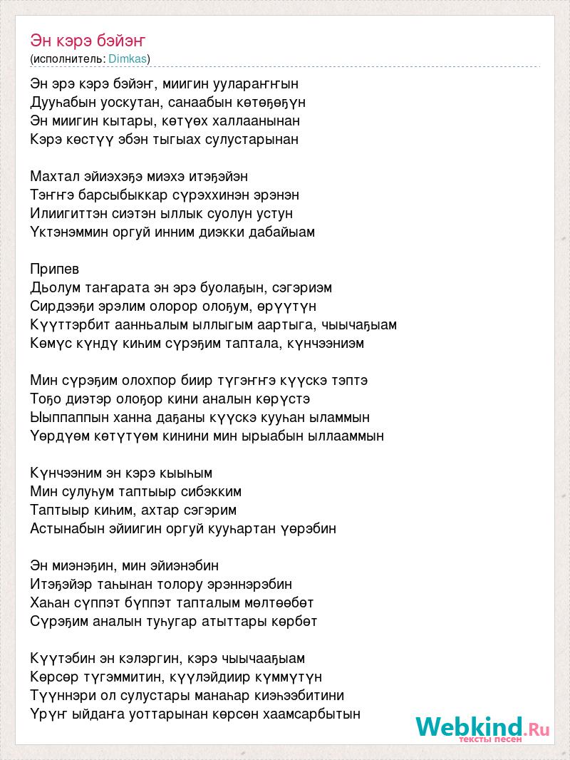 Эн эрэ кэрэ бэйэҥ, миигин уулараҥҥын Дууһабын уоскутан, санаабын көтөҕөҕүн Эн миигин кытары, көтүөх халлаанынан Кэрэ көстүү эбэн тыгыах сулустарынан Махтал эйиэхэҕэ миэхэ итэҕэйэн Тэҥҥэ барсыбыккар сүрэххинэн эрэнэн Илиигиттэн сиэтэн ыллык суолун устун Үктэнэммин оргуй инним диэкки дабайыам Припев Дьолум таҥарата эн эрэ буолаҕын, сэгэриэм Сирдээҕи эрэлим олорор олоҕум, өрүүтүн Күүттэрбит аанньалым ыллыгым аартыга, чыычаҕыам Көмүс күндү киһим сүрэҕим таптала, күнчээниэм Мин сүрэҕим олохпор биир түгэҥҥэ күүскэ тэптэ Тоҕо диэтэр олоҕор кини аналын көрүстэ Ыыппаппын ханна даҕаны күүскэ кууһан ыламмын Үөрдүөм көтүтүөм кинини мин ырыабын ыллааммын Күнчээним эн кэрэ кыыһым Мин сулуһум таптыыр сибэкким Таптыыр киһим, ахтар сэгэрим Астынабын эйиигин оргуй кууһартан үөрэбин Эн миэнэҕин, мин эйиэнэбин Итэҕэйэр таһынан толору эрэннэрэбин Хаһан сүппэт бүппэт тапталым мөлтөөбөт Сүрэҕим аналын туһугар атыттары көрбөт Күүтэбин эн кэлэргин, кэрэ чыычааҕыам Көрсөр түгэммитин, күүлэйдиир күммүтүн Түүннэри ол сулустары манаһар киэһээбитини Үрүҥ ыйдаҥа уоттарынан көрсөн хаамсарбытын