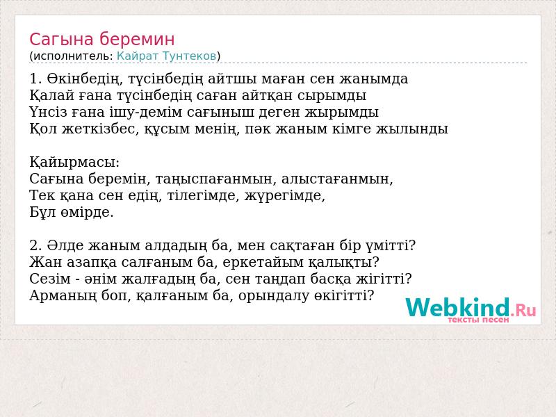1. Өкінбедің, түсінбедің айтшы маған сен жанымда Қалай ғана түсінбедің саған айтқан сырымды Үнсіз ғана ішу-демім сағыныш деген жырымды Қол жеткізбес, құсым менің, пәк жаным кімге жылынды Қайырмасы: Сағына беремін, таңыспағанмын, алыстағанмын, Тек қана сен едің, тілегімде, жүрегімде, Бұл өмірде. 2. Әлде жаным алдадың ба, мен сақтаған бір үмітті? Жан азапқа салғаным ба, еркетайым қалықты? Сезім - әнім жалғадың ба, сен таңдап басқа жігітті? Арманың боп, қалғаным ба, орындалу өкігітті?