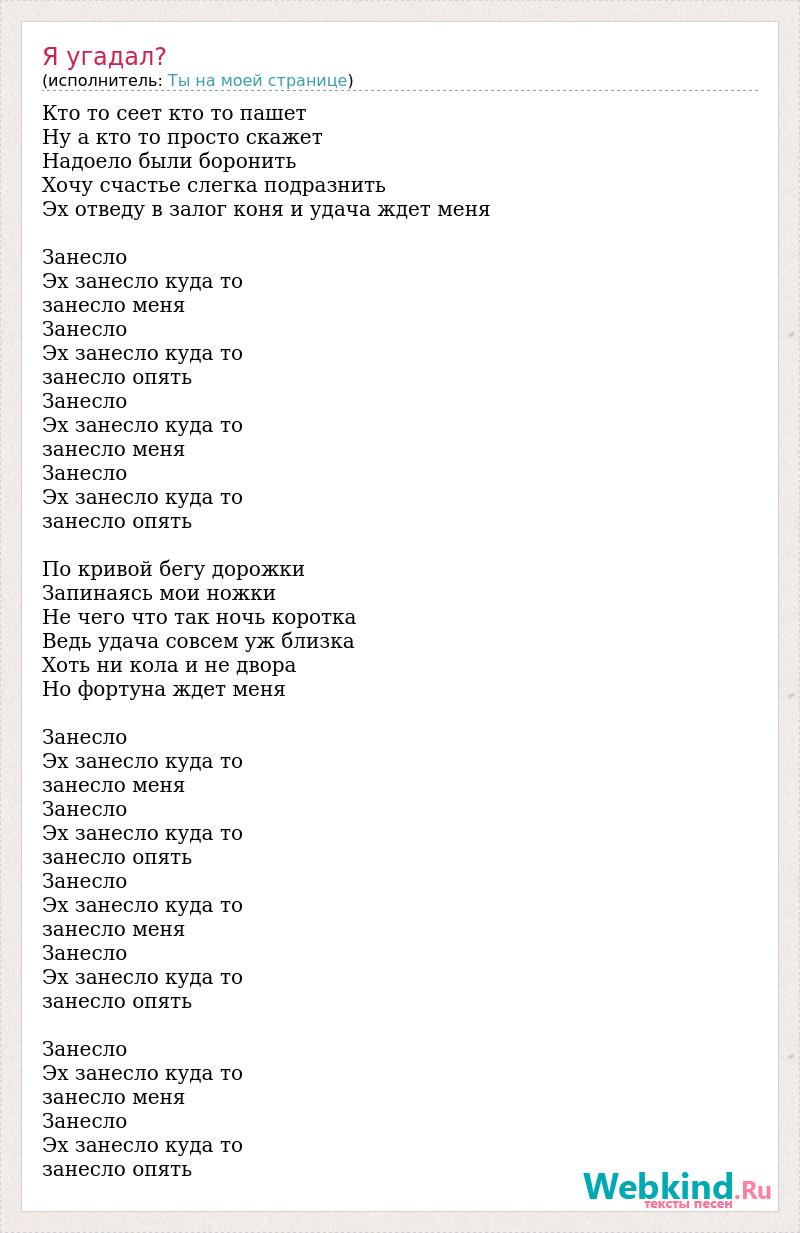 Кто то сеет кто то пашет Ну а кто то просто скажет Надоело были боронить Хочу счастье слегка подразнить Эх отведу в залог коня и удача ждет меня Занесло Эх занесло куда то занесло меня Занесло Эх занесло куда то занесло опять Занесло Эх занесло куда то занесло меня Занесло Эх занесло куда то занесло опять По кривой бегу дорожки Запинаясь мои ножки Не чего что так ночь коротка Ведь удача совсем уж близка Хоть ни кола и не двора Но фортуна ждет меня Занесло Эх занесло куда то занесло меня Занесло Эх занесло куда то занесло опять Занесло Эх занесло куда то занесло меня Занесло Эх занесло куда то занесло опять Занесло Эх занесло куда то занесло меня Занесло Эх занесло куда то занесло опять