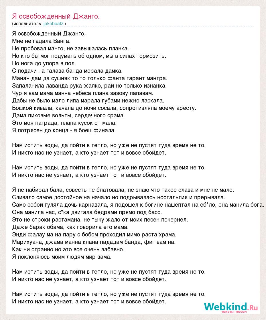 Я освобожденный Джанго. Мне не гадала Ванга. Не пробовал манго, не завышалась планка. Но кто бы мог подумать об одном, мы в силах тормозить. Но нога до упора в пол. С подачи на галава банда морала дамка. Манан дам да сушняк то то только фанта гарант мантра. Запаланила лаванда рука жалко, рай но только изнанка. Чур я вам мама манна небеса плана зазову папавам. Дабы не было мало липа марала губами нежно ласкала. Бошкой кивала, качала до ночи сосала, сопротивляла моему аресту. Дама пиковые вольты, сердечного срама. Это моя награда, плана кусок от мала. Я потрясен до конца - я боец финала. Нам испить воды, да пойти в тепло, но уже не пустят туда время не то. И никто нас не узнает, а кто узнает тот и вовсе обойдет. Нам испить воды, да пойти в тепло, но уже не пустят туда время не то. И никто нас не узнает, а кто узнает тот и вовсе обойдет. Я не набирал бала, совесть не блатовала, не знаю что такое слава и мне не мало. Сливало самое достойное на начало но подрывалась ностальгия и прерывала. Само собой гуляла дочь карнавала, я подошел к богине нашептал на еб*ло, она манила бога. Она манила нас, с*ка двигала бедрами прямо под басс. Это не строки растамана, не тычу жало от моих песен почернел. Даже барак обама, как говорила его мама. Энди фалау ма на пару с бобом проходил мимо раста храма. Марихуана, джама манна клана пададам банда, фиг вам на. Как ни странно но это все очень забавно. Я поклоняюсь моим людям мир вама. Нам испить воды, да пойти в тепло, но уже не пустят туда время не то. И никто нас не узнает, а кто узнает тот и вовсе обойдет. Нам испить воды, да пойти в тепло, но уже не пустят туда время не то. И никто нас не узнает, а кто узнает тот и вовсе обойдет.