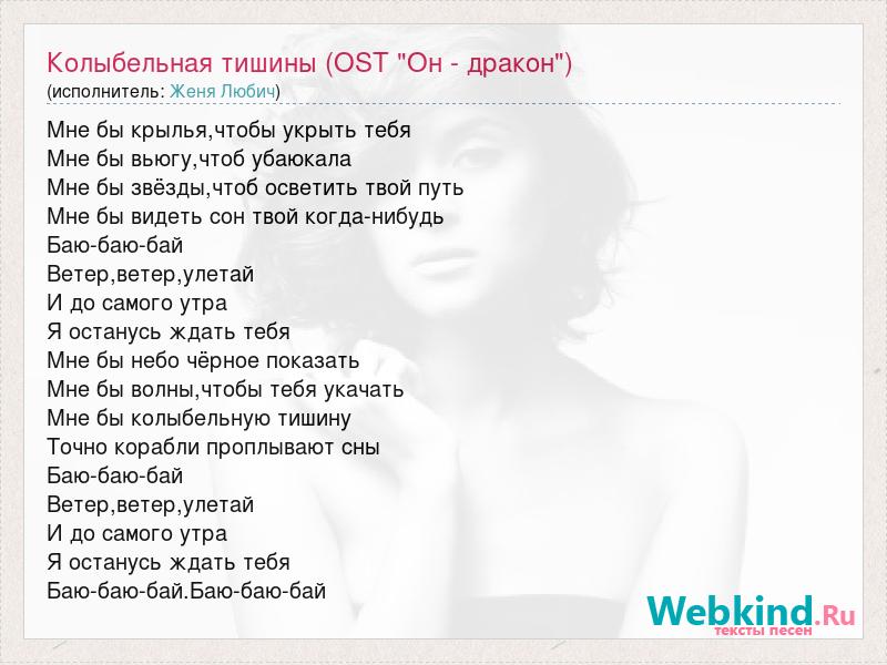 Мне бы крылья,чтобы укрыть тебя Мне бы вьюгу,чтоб убаюкала Мне бы звёзды,чтоб осветить твой путь Мне бы видеть сон твой когда-нибудь Баю-баю-бай Ветер,ветер,улетай И до самого утра Я останусь ждать тебя Мне бы небо чёрное показать Мне бы волны,чтобы тебя укачать Мне бы колыбельную тишину Точно корабли проплывают сны Баю-баю-бай Ветер,ветер,улетай И до самого утра Я останусь ждать тебя Баю-баю-бай.Баю-баю-бай