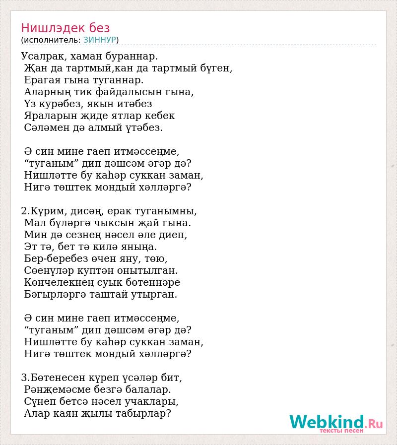 Усалрак, хаман бураннар. Җан да тартмый,кан да тартмый бүген, Ерагая гына туганнар. Аларның тик файдалысын гына, Үз курәбез, якын итәбез Яраларын җиде ятлар кебек Сәләмен дә алмый үтәбез. Ә син мине гаеп итмәссеңме, “туганым” дип дәшсәм әгәр дә? Нишләтте бу каһәр суккан заман, Нигә төштек мондый хәлләргә? 2.Күрим, дисәң, ерак туганымны, Мал бүләргә чыксын җай гына. Мин дә сезнең нәсел әле диеп, Эт тә, бет тә килә яныңа. Бер-беребез өчен яну, төю, Сөенүләр куптән онытылган. Көнчелекнең суык бөтеннәре Бәгырләргә таштай утырган. Ә син мине гаеп итмәссеңме, “туганым” дип дәшсәм әгәр дә? Нишләтте бу каһәр суккан заман, Нигә төштек мондый хәлләргә? 3.Бөтенесен күреп үсәләр бит, Рәнҗемәсме безгә балалар. Сүнеп бетсә нәсел учаклары, Алар каян җылы табырлар?