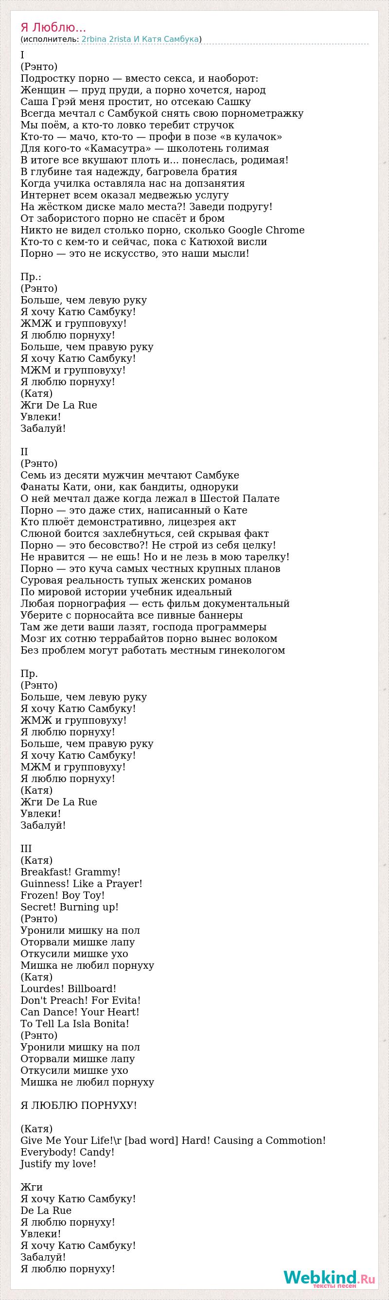 I (Рэнто) Подростку порно — вместо секса, и наоборот: Женщин — пруд пруди, а порно хочется, народ Саша Грэй меня простит, но отсекаю Сашку Всегда мечтал с Самбукой снять свою порнометражку Мы поём, а кто-то ловко теребит стручок Кто-то — мачо, кто-то — профи в позе «в кулачок» Для кого-то «Камасутра» — школотень голимая В итоге все вкушают плоть и... понеслась, родимая! В глубине тая надежду, багровела братия Когда училка оставляла нас на допзанятия Интернет всем оказал медвежью услугу На жёстком диске мало места?! Заведи подругу! От забористого порно не спасёт и бром Никто не видел столько порно, сколько Google Chrome Кто-то с кем-то и сейчас, пока с Катюхой висли Порно — это не искусство, это наши мысли! Пр.: (Рэнто) Больше, чем левую руку Я хочу Катю Самбуку! ЖМЖ и групповуху! Я люблю порнуху! Больше, чем правую руку Я хочу Катю Самбуку! МЖМ и групповуху! Я люблю порнуху! (Катя) Жги De La Rue Увлеки! Забалуй! II (Рэнто) Семь из десяти мужчин мечтают Самбуке Фанаты Кати, они, как бандиты, одноруки О ней мечтал даже когда лежал в Шестой Палате Порно — это даже стих, написанный о Кате Кто плюёт демонстративно, лицезрея акт Слюной боится захлебнуться, сей скрывая факт Порно — это бесовство?! Не строй из себя целку! Не нравится — не ешь! Но и не лезь в мою тарелку! Порно — это куча самых честных крупных планов Суровая реальность тупых женских романов По мировой истории учебник идеальный Любая порнография — есть фильм документальный Уберите с порносайта все пивные баннеры Там же дети ваши лазят, господа программеры Мозг их сотню террабайтов порно вынес волоком Без проблем могут работать местным гинекологом Пр. (Рэнто) Больше, чем левую руку Я хочу Катю Самбуку! ЖМЖ и групповуху! Я люблю порнуху! Больше, чем правую руку Я хочу Катю Самбуку! МЖМ и групповуху! Я люблю порнуху! (Катя) Жги De La Rue Увлеки! Забалуй! III (Катя) Breakfast! Grammy! Guinness! Like a Prayer! Frozen! Boy Toy! Secret! Burning up! (Рэнто) Уронили мишку на пол Оторвали мишке лапу Откусили мишке ухо Мишка не любил порнуху (Катя) Lourdes! Billboard! Don't Preach! For Evita! Can Dance! Your Heart! To Tell La Isla Bonita! (Рэнто) Уронили мишку на пол Оторвали мишке лапу Откусили мишке ухо Мишка не любил порнуху Я ЛЮБЛЮ ПОРНУХУ! (Катя) Give Me Your Life!\r [bad word] Hard! Causing a Commotion! Everybody! Candy! Justify my love! Жги Я хочу Катю Самбуку! De La Rue Я люблю порнуху! Увлеки! Я хочу Катю Самбуку! Забалуй! Я люблю порнуху!