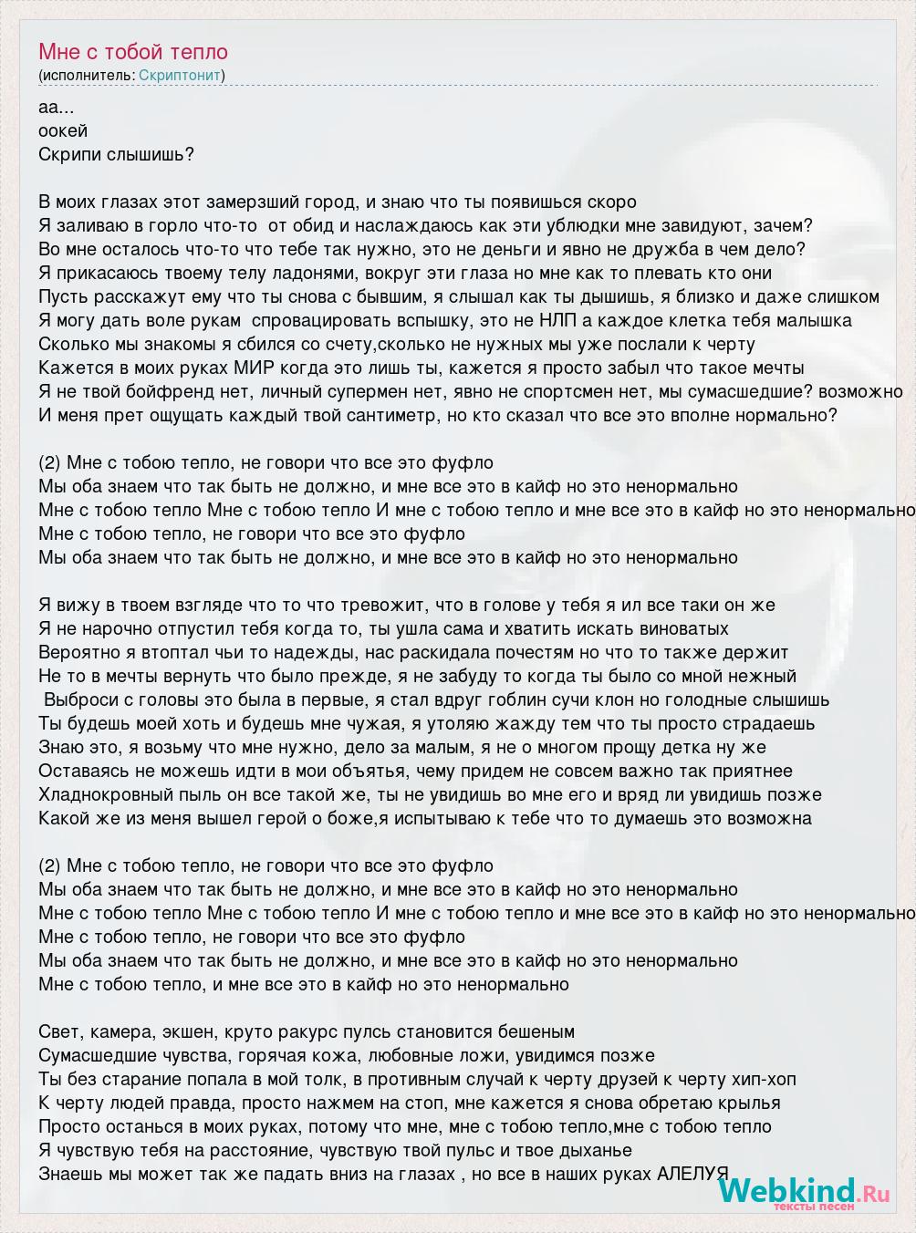аа... оокей Скрипи слышишь? В моих глазах этот замерзший город, и знаю что ты появишься скоро Я заливаю в горло что-то от обид и наслаждаюсь как эти ублюдки мне завидуют, зачем? Во мне осталось что-то что тебе так нужно, это не деньги и явно не дружба в чем дело? Я прикасаюсь твоему телу ладонями, вокруг эти глаза но мне как то плевать кто они Пусть расскажут ему что ты снова с бывшим, я слышал как ты дышишь, я близко и даже слишком Я могу дать воле рукам спровацировать вспышку, это не НЛП а каждое клетка тебя малышка Сколько мы знакомы я сбился со счету,сколько не нужных мы уже послали к черту Кажется в моих руках МИР когда это лишь ты, кажется я просто забыл что такое мечты Я не твой бойфренд нет, личный супермен нет, явно не спортсмен нет, мы сумасшедшие? возможно И меня прет ощущать каждый твой сантиметр, но кто сказал что все это вполне нормально? (2) Мне с тобою тепло, не говори что все это фуфло Мы оба знаем что так быть не должно, и мне все это в кайф но это ненормально Мне с тобою тепло Мне с тобою тепло И мне с тобою тепло и мне все это в кайф но это ненормально Мне с тобою тепло, не говори что все это фуфло Мы оба знаем что так быть не должно, и мне все это в кайф но это ненормально Я вижу в твоем взгляде что то что тревожит, что в голове у тебя я ил все таки он же Я не нарочно отпустил тебя когда то, ты ушла сама и хватить искать виноватых Вероятно я втоптал чьи то надежды, нас раскидала почестям но что то также держит Не то в мечты вернуть что было прежде, я не забуду то когда ты было со мной нежный Выброси с головы это была в первые, я стал вдруг гоблин сучи клон но голодные слышишь Ты будешь моей хоть и будешь мне чужая, я утоляю жажду тем что ты просто страдаешь Знаю это, я возьму что мне нужно, дело за малым, я не о многом прощу детка ну же Оставаясь не можешь идти в мои объятья, чему придем не совсем важно так приятнее Хладнокровный пыль он все такой же, ты не увидишь во мне его и вряд ли увидишь позже Какой же из меня вышел герой о боже,я испытываю к тебе что то думаешь это возможна (2) Мне с тобою тепло, не говори что все это фуфло Мы оба знаем что так быть не должно, и мне все это в кайф но это ненормально Мне с тобою тепло Мне с тобою тепло И мне с тобою тепло и мне все это в кайф но это ненормально Мне с тобою тепло, не говори что все это фуфло Мы оба знаем что так быть не должно, и мне все это в кайф но это ненормально Мне с тобою тепло, и мне все это в кайф но это ненормально Свет, камера, экшен, круто ракурс пулсь становится бешеным Сумасшедшие чувства, горячая кожа, любовные ложи, увидимся позже Ты без старание попала в мой толк, в противным случай к черту друзей к черту хип-хоп К черту людей правда, просто нажмем на стоп, мне кажется я снова обретаю крылья Просто останься в моих руках, потому что мне, мне с тобою тепло,мне с тобою тепло Я чувствую тебя на расстояние, чувствую твой пульс и твое дыханье Знаешь мы может так же падать вниз на глазах , но все в наших руках АЛЕЛУЯ