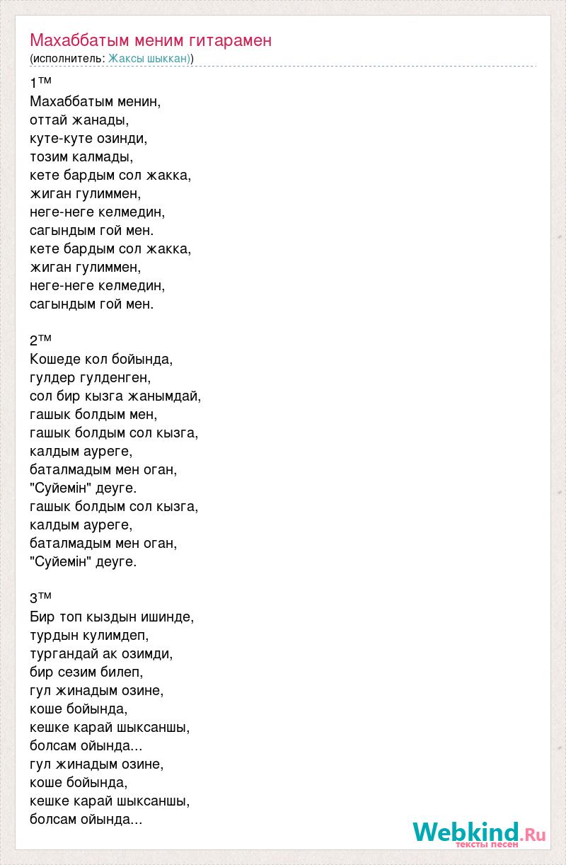 1™ Махаббатым менин, оттай жанады, куте-куте озинди, тозим калмады, кете бардым сол жакка, жиган гулиммен, неге-неге келмедин, сагындым гой мен. кете бардым сол жакка, жиган гулиммен, неге-неге келмедин, сагындым гой мен. 2™ Кошеде кол бойында, гулдер гулденген, сол бир кызга жанымдай, гашык болдым мен, гашык болдым сол кызга, калдым ауреге, баталмадым мен оган, "Суйемiн" деуге. гашык болдым сол кызга, калдым ауреге, баталмадым мен оган, "Суйемiн" деуге. 3™ Бир топ кыздын ишинде, турдын кулимдеп, тургандай ак озимди, бир сезим билеп, гул жинадым озине, коше бойында, кешке карай шыксаншы, болсам ойында... гул жинадым озине, коше бойында, кешке карай шыксаншы, болсам ойында...