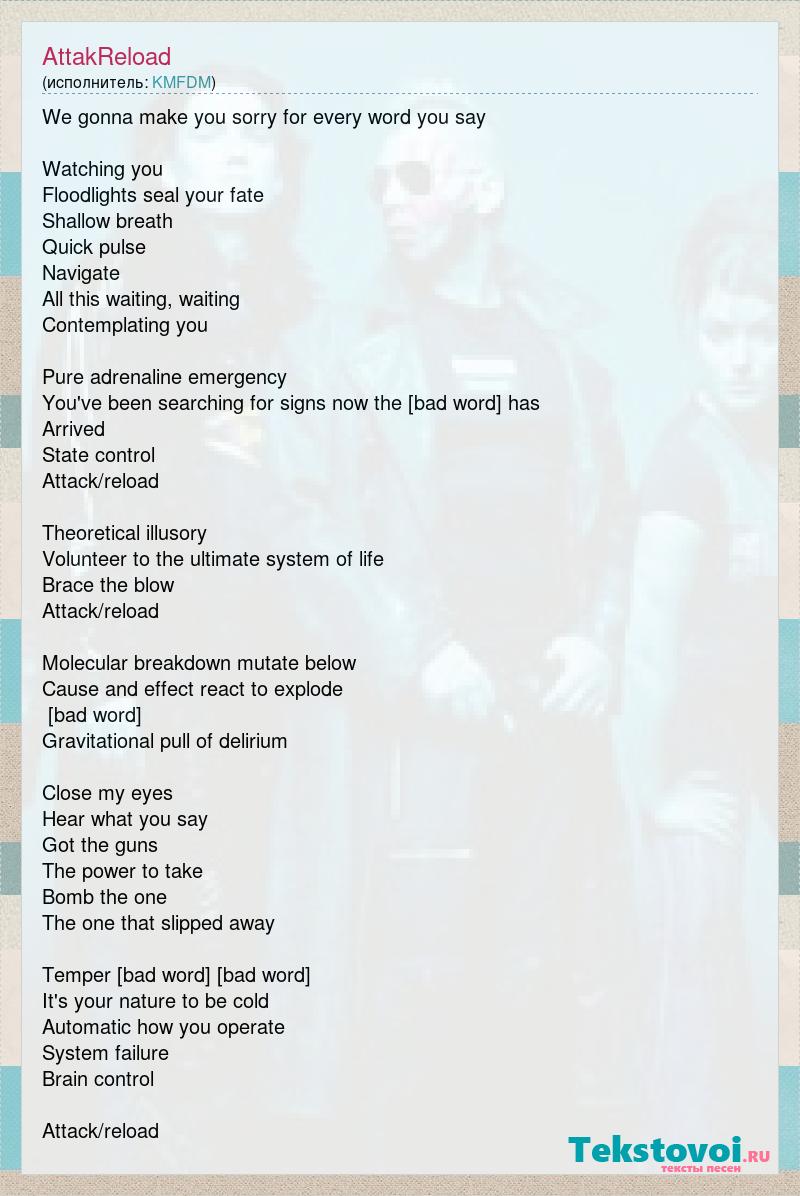 We gonna make you sorry for every word you say Watching you Floodlights seal your fate Shallow breath Quick pulse Navigate All this waiting, waiting Contemplating you Pure adrenaline emergency You've been searching for signs now the [bad word] has Arrived State control Attack/reload Theoretical illusory Volunteer to the ultimate system of life Brace the blow Attack/reload Molecular breakdown mutate below Cause and effect react to explode [bad word] Gravitational pull of delirium Close my eyes Hear what you say Got the guns The power to take Bomb the one The one that slipped away Temper [bad word] [bad word] It's your nature to be cold Automatic how you operate System failure Brain control Attack/reload