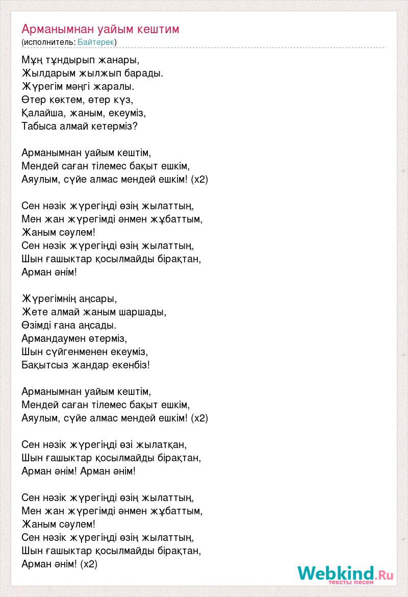 Мұң тұндырып жанары, Жылдарым жылжып барады. Жүрегім мәңгі жаралы. Өтер көктем, өтер күз, Қалайша, жаным, екеуміз, Табыса алмай кетерміз? Арманымнан уайым кештім, Мендей саған тілемес бақыт ешкім, Аяулым, сүйе алмас мендей ешкім! (х2) Сен нәзік жүрегіңді өзің жылаттың, Мен жан жүрегімді әнмен жұбаттым, Жаным сәулем! Сен нәзік жүрегіңді өзің жылаттың, Шын ғашыктар қосылмайды бірақтан, Арман әнім! Жүрегімнің аңсары, Жете алмай жаным шаршады, Өзімді ғана аңсады. Армандаумен өтерміз, Шын сүйгенменен екеуміз, Бақытсыз жандар екенбіз! Арманымнан уайым кештім, Мендей саған тілемес бақыт ешкім, Аяулым, сүйе алмас мендей ешкім! (х2) Сен нәзік жүрегіңді өзі жылатқан, Шын ғашыктар қосылмайды бірақтан, Арман әнім! Арман әнім! Сен нәзік жүрегіңді өзің жылаттың, Мен жан жүрегімді әнмен жұбаттым, Жаным сәулем! Сен нәзік жүрегіңді өзің жылаттың, Шын ғашыктар қосылмайды бірақтан, Арман әнім! (х2)
