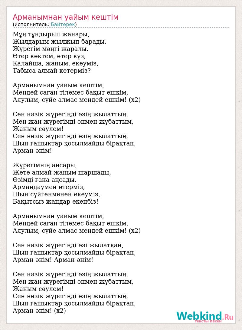 Мұң тұндырып жанары, Жылдарым жылжып барады. Жүрегім мәңгі жаралы. Өтер көктем, өтер күз, Қалайша, жаным, екеуміз, Табыса алмай кетерміз? Арманымнан уайым кештім, Мендей саған тілемес бақыт ешкім, Аяулым, сүйе алмас мендей ешкім! (х2) Сен нәзік жүрегіңді өзің жылаттың, Мен жан жүрегімді әнмен жұбаттым, Жаным сәулем! Сен нәзік жүрегіңді өзің жылаттың, Шын ғашыктар қосылмайды бірақтан, Арман әнім! Жүрегімнің аңсары, Жете алмай жаным шаршады, Өзімді ғана аңсады. Армандаумен өтерміз, Шын сүйгенменен екеуміз, Бақытсыз жандар екенбіз! Арманымнан уайым кештім, Мендей саған тілемес бақыт ешкім, Аяулым, сүйе алмас мендей ешкім! (х2) Сен нәзік жүрегіңді өзі жылатқан, Шын ғашыктар қосылмайды бірақтан, Арман әнім! Арман әнім! Сен нәзік жүрегіңді өзің жылаттың, Мен жан жүрегімді әнмен жұбаттым, Жаным сәулем! Сен нәзік жүрегіңді өзің жылаттың, Шын ғашыктар қосылмайды бірақтан, Арман әнім! (х2)
