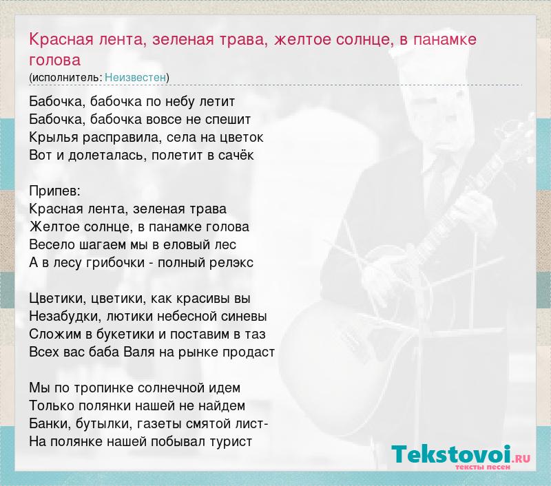 Бабочка, бабочка по небу летит Бабочка, бабочка вовсе не спешит Крылья расправила, села на цветок Вот и долеталась, полетит в сачёк Припев: Красная лента, зеленая трава Желтое солнце, в панамке голова Весело шагаем мы в еловый лес А в лесу грибочки - полный релэкс Цветики, цветики, как красивы вы Незабудки, лютики небесной синевы Сложим в букетики и поставим в таз Всех вас баба Валя на рынке продаст Мы по тропинке солнечной идем Только полянки нашей не найдем Банки, бутылки, газеты смятой лист- На полянке нашей побывал турист