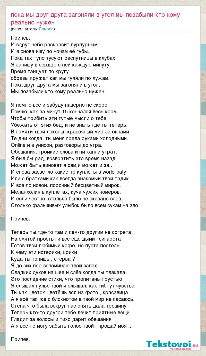 Припев: И вдруг небо раскрасит пурпурным И я снова ищу по ночам её губы. Пока так тупо тусуют распутницы в клубах Я запишу в сердце с ней каждую минуту. Время танцует по кругу. образы кружат как мы гуляли по лужам. Пока друг друга мы загоняли в угол, Мы позабыли кто кому реально нужен. Я помню всё и забуду наверно не скоро. Помню, как за минут 15 кончался весь корм. Чтобы прибить эти тупые мысли о тебе Убежать от этих бед, и не знать где ты теперь. В памяти твои локоны, красочный мир за окнами Те дни когда, ты меня грела руками холодными. Online и в унисон, разговоры до утра. Обещания, громкие слова и ни капли утрат. Я был бы рад, возвратить это время назад. Может быть,виноват я сам,и может и за.. И снова засветло какие-то куплеты в world-paty Или с братками как всегда знакомый твой падик И все по новой..порочный бесцветный мирок. Меланхолия в куплетах, куча чужих номеров. И если честно, столько было не сказано слов. Столько фальшивых улыбок было всем сукам на зло. Припев. Теперь ты где-то там и кем-то другим не согрета На смятой простыни всё ещё дымит сигарета Готов твой любимый кофе, но пуста постель К чему эти истерики, крики Куда ты топишь , стерва ? Я до сих пор вспоминаю твой запах Сладких духов на шее и слёз когда ты плакала Это последние стихи, что пропитаны грустью Я слышал пульс твой и слышал, как гибнут чувства Ты как цветок цветёшь вся на фото , красавица А я всё так же с блокнотом в твой мир не касаюсь. Стена что была вокруг нас опять дала трещину Теперь кто-то другой тебе лечит приятные вещи Гладит за волосы и тихо дарит обещания А я всё не могу забыть голос твой , прощай моя ... Припев.