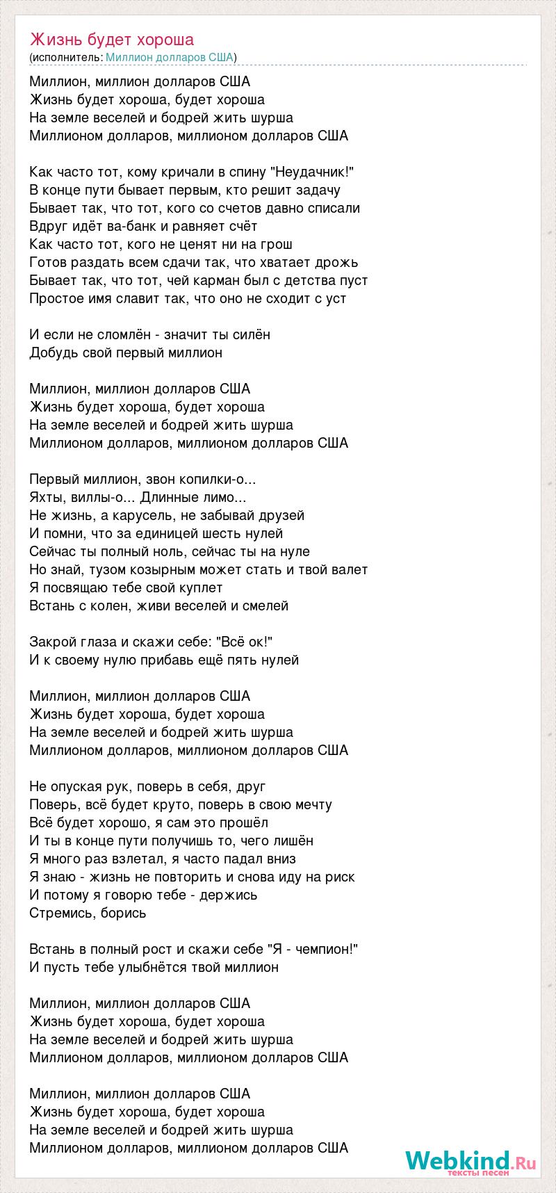 Миллион, миллион долларов США Жизнь будет хороша, будет хороша На земле веселей и бодрей жить шурша Миллионом долларов, миллионом долларов США Как часто тот, кому кричали в спину "Неудачник!" В конце пути бывает первым, кто решит задачу Бывает так, что тот, кого со счетов давно списали Вдруг идёт ва-банк и равняет счёт Как часто тот, кого не ценят ни на грош Готов раздать всем сдачи так, что хватает дрожь Бывает так, что тот, чей карман был с детства пуст Простое имя славит так, что оно не сходит с уст И если не сломлён - значит ты силён Добудь свой первый миллион Миллион, миллион долларов США Жизнь будет хороша, будет хороша На земле веселей и бодрей жить шурша Миллионом долларов, миллионом долларов США Первый миллион, звон копилки-о... Яхты, виллы-о... Длинные лимо... Не жизнь, а карусель, не забывай друзей И помни, что за единицей шесть нулей Сейчас ты полный ноль, сейчас ты на нуле Но знай, тузом козырным может стать и твой валет Я посвящаю тебе свой куплет Встань с колен, живи веселей и смелей Закрой глаза и скажи себе: "Всё ок!" И к своему нулю прибавь ещё пять нулей Миллион, миллион долларов США Жизнь будет хороша, будет хороша На земле веселей и бодрей жить шурша Миллионом долларов, миллионом долларов США Не опуская рук, поверь в себя, друг Поверь, всё будет круто, поверь в свою мечту Всё будет хорошо, я сам это прошёл И ты в конце пути получишь то, чего лишён Я много раз взлетал, я часто падал вниз Я знаю - жизнь не повторить и снова иду на риск И потому я говорю тебе - держись Стремись, борись Встань в полный рост и скажи себе "Я - чемпион!" И пусть тебе улыбнётся твой миллион Миллион, миллион долларов США Жизнь будет хороша, будет хороша На земле веселей и бодрей жить шурша Миллионом долларов, миллионом долларов США Миллион, миллион долларов США Жизнь будет хороша, будет хороша На земле веселей и бодрей жить шурша Миллионом долларов, миллионом долларов США