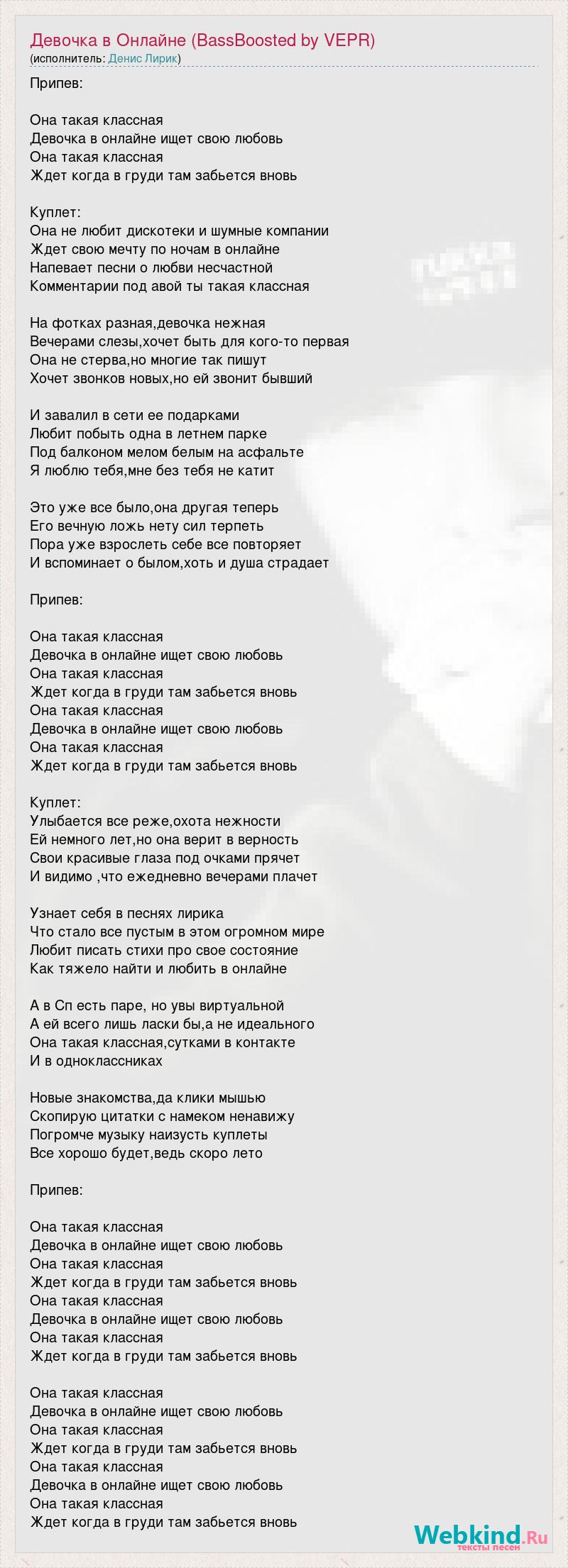 Припев: Она такая классная Девочка в онлайне ищет свою любовь Она такая классная Ждет когда в груди там забьется вновь Куплет: Она не любит дискотеки и шумные компании Ждет свою мечту по ночам в онлайне Напевает песни о любви несчастной Комментарии под авой ты такая классная На фотках разная,девочка нежная Вечерами слезы,хочет быть для кого-то первая Она не стерва,но многие так пишут Хочет звонков новых,но ей звонит бывший И завалил в сети ее подарками Любит побыть одна в летнем парке Под балконом мелом белым на асфальте Я люблю тебя,мне без тебя не катит Это уже все было,она другая теперь Его вечную ложь нету сил терпеть Пора уже взрослеть себе все повторяет И вспоминает о былом,хоть и душа страдает Припев: Она такая классная Девочка в онлайне ищет свою любовь Она такая классная Ждет когда в груди там забьется вновь Она такая классная Девочка в онлайне ищет свою любовь Она такая классная Ждет когда в груди там забьется вновь Куплет: Улыбается все реже,охота нежности Ей немного лет,но она верит в верность Свои красивые глаза под очками прячет И видимо ,что ежедневно вечерами плачет Узнает себя в песнях лирика Что стало все пустым в этом огромном мире Любит писать стихи про свое состояние Как тяжело найти и любить в онлайне А в Сп есть паре, но увы виртуальной А ей всего лишь ласки бы,а не идеального Она такая классная,сутками в контакте И в одноклассниках Новые знакомства,да клики мышью Скопирую цитатки с намеком ненавижу Погромче музыку наизусть куплеты Все хорошо будет,ведь скоро лето Припев: Она такая классная Девочка в онлайне ищет свою любовь Она такая классная Ждет когда в груди там забьется вновь Она такая классная Девочка в онлайне ищет свою любовь Она такая классная Ждет когда в груди там забьется вновь Она такая классная Девочка в онлайне ищет свою любовь Она такая классная Ждет когда в груди там забьется вновь Она такая классная Девочка в онлайне ищет свою любовь Она такая классная Ждет когда в груди там забьется вновь