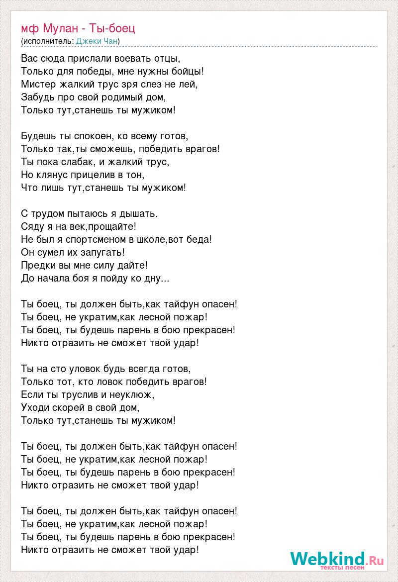 Вас сюда прислали воевать отцы, Только для победы, мне нужны бойцы! Мистер жалкий трус зря слез не лей, Забудь про свой родимый дом, Только тут,станешь ты мужиком! Будешь ты спокоен, ко всему готов, Только так,ты сможешь, победить врагов! Ты пока слабак, и жалкий трус, Но клянус прицелив в тон, Что лишь тут,станешь ты мужиком! С трудом пытаюсь я дышать. Сяду я на век,прощайте! Не был я спортсменом в школе,вот беда! Он сумел их запугать! Предки вы мне силу дайте! До начала боя я пойду ко дну... Ты боец, ты должен быть,как тайфун опасен! Ты боец, не укратим,как лесной пожар! Ты боец, ты будешь парень в бою прекрасен! Никто отразить не сможет твой удар! Ты на сто уловок будь всегда готов, Только тот, кто ловок победить врагов! Если ты труслив и неуклюж, Уходи скорей в свой дом, Только тут,станешь ты мужиком! Ты боец, ты должен быть,как тайфун опасен! Ты боец, не укратим,как лесной пожар! Ты боец, ты будешь парень в бою прекрасен! Никто отразить не сможет твой удар! Ты боец, ты должен быть,как тайфун опасен! Ты боец, не укратим,как лесной пожар! Ты боец, ты будешь парень в бою прекрасен! Никто отразить не сможет твой удар!