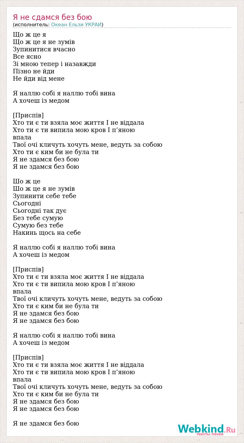 Що ж це я Що ж це я не зумів Зупинитися вчасно Все ясно Зі мною тепер і назавжди Пізно не йди Не йди від мене Я наллю собі я наллю тобі вина А хочеш із медом [Приспів] Хто ти є ти взяла моє життя І не віддала Хто ти є ти випила мою кров І п’яною впала Твої очі кличуть хочуть мене, ведуть за собою Хто ти є ким би не була ти Я не здамся без бою Я не здамся без бою Шо ж це Шо ж це я не зумів Зупинити себе тебе Сьогодні Сьогодні так дує Без тебе сумую Сумую без тебе Накинь щось на себе Я наллю собі я наллю тобі вина А хочеш із медом [Приспів] Хто ти є ти взяла моє життя І не віддала Хто ти є ти випила мою кров І п’яною впала Твої очі кличуть хочуть мене, ведуть за собою Хто ти є ким би не була ти Я не здамся без бою Я не здамся без бою Я наллю собі я наллю тобі вина А хочеш із медом [Приспів] Хто ти є ти взяла моє життя І не віддала Хто ти є ти випила мою кров І п’яною впала Твої очі кличуть хочуть мене, ведуть за собою Хто ти є ким би не була ти Я не здамся без бою Я не здамся без бою Я не здамся без бою