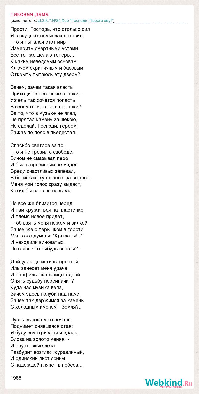Прости, Господь, что столько сил Я в скудных помыслах оставил, Что я пытался этот мир Измерить смертными устами. Все то же делаю теперь... К каким неведомым основам Ключом скрипичным и басовым Открыть пытаюсь эту дверь? Зачем, зачем такая власть Приходит в песенные строки, - Ужель так хочется попасть В своем отечестве в пророки? За то, что в музыке не лгал, Не прятал камень за щекою, Не сделай, Господи, героем, Зажав по пояс в пьедестал. Спасибо светлое за то, Что я не грезил о свободе, Вином не смазывал перо И был в провинции не моден. Среди счастливых запевал, В ботинках, купленных на вырост, Меня мой голос сразу выдаст, Каких бы слов не называл. Но все же близится черед И нам кружиться на пластинке, И племя новое придет, Чтоб взять меня ножом и вилкой. Зачем же с перышком в горсти Мы тоже думали: "Крылаты!.." - И находили виноватых, Пытаясь что-нибудь спасти?.. Дойду ль до истины простой, Иль занесет меня удача И профиль школьницы одной Опять судьбу переиначит? Куда нас музыка вела, Зачем здесь голуби над нами, Зачем так держимся за камень С холодным именем - Земля?.. Пусть высоко мою печаль Поднимет снявшаяся стая: Я буду всматриваться вдаль, Слова на золото меняя, - И опустевшие леса Разбудит возглас журавлиный, И одинокий лист осины С надеждой глянет в небеса... 1985