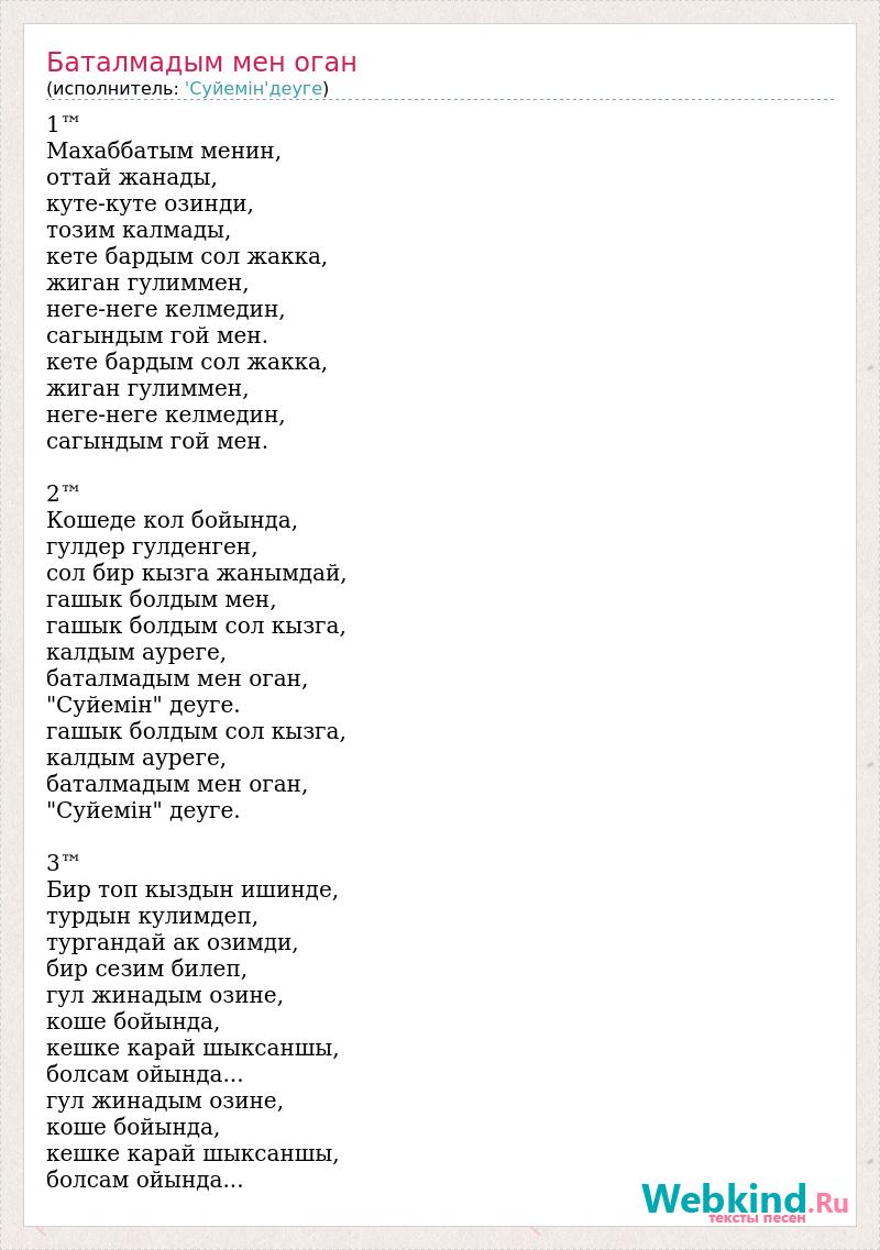 1™ Махаббатым менин, оттай жанады, куте-куте озинди, тозим калмады, кете бардым сол жакка, жиган гулиммен, неге-неге келмедин, сагындым гой мен. кете бардым сол жакка, жиган гулиммен, неге-неге келмедин, сагындым гой мен. 2™ Кошеде кол бойында, гулдер гулденген, сол бир кызга жанымдай, гашык болдым мен, гашык болдым сол кызга, калдым ауреге, баталмадым мен оган, "Суйемiн" деуге. гашык болдым сол кызга, калдым ауреге, баталмадым мен оган, "Суйемiн" деуге. 3™ Бир топ кыздын ишинде, турдын кулимдеп, тургандай ак озимди, бир сезим билеп, гул жинадым озине, коше бойында, кешке карай шыксаншы, болсам ойында... гул жинадым озине, коше бойында, кешке карай шыксаншы, болсам ойында...
